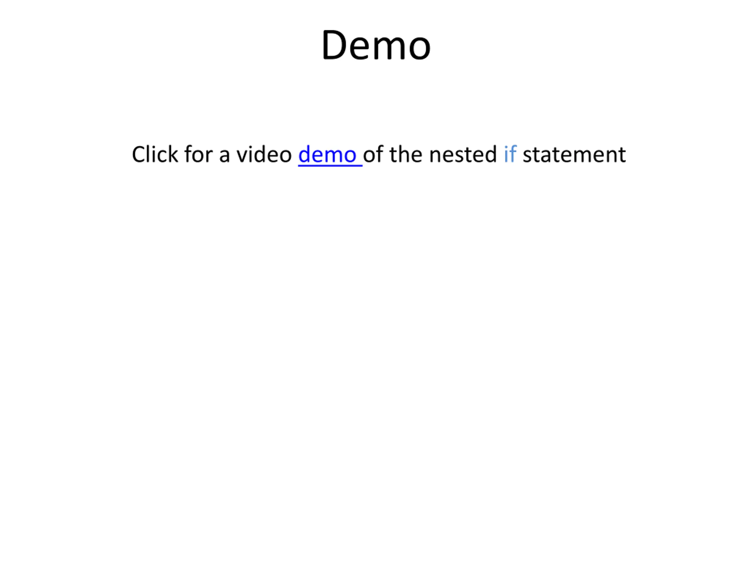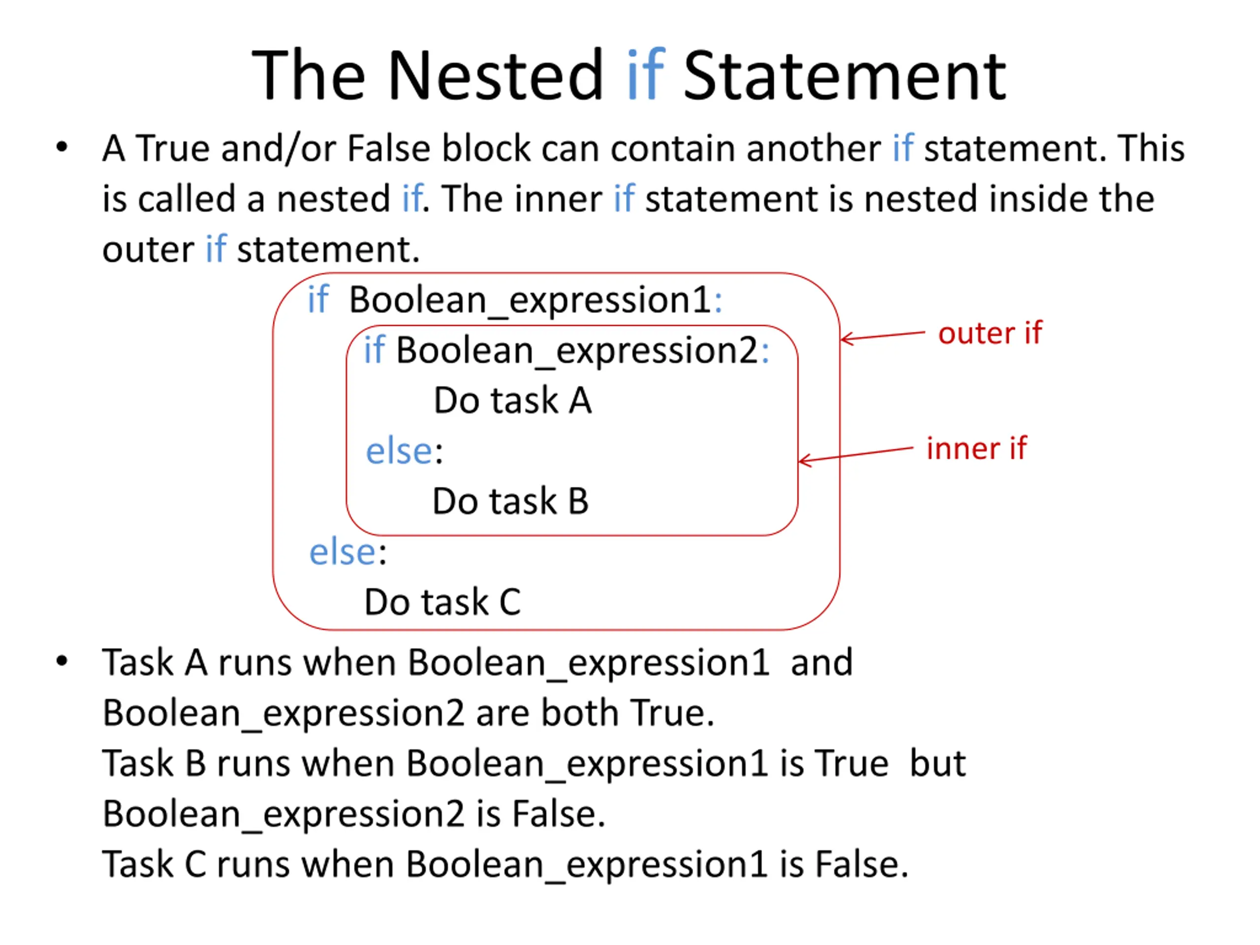 The Nested if Statement A True and/or False block can contain another if statement. This is called a nested if. The inner if statement is nested inside the outer if statement. if Boolean_expression1: if Boolean_expression2: Do task A else: Do task B else: Do task C Task A runs when Boolean_expression1 and Boolean_expression2 are both True. Task B runs when Boolean_expression1 is True but Boolean_expression2 is False. Task C runs when Boolean_expression1 is False. outer if inner if
