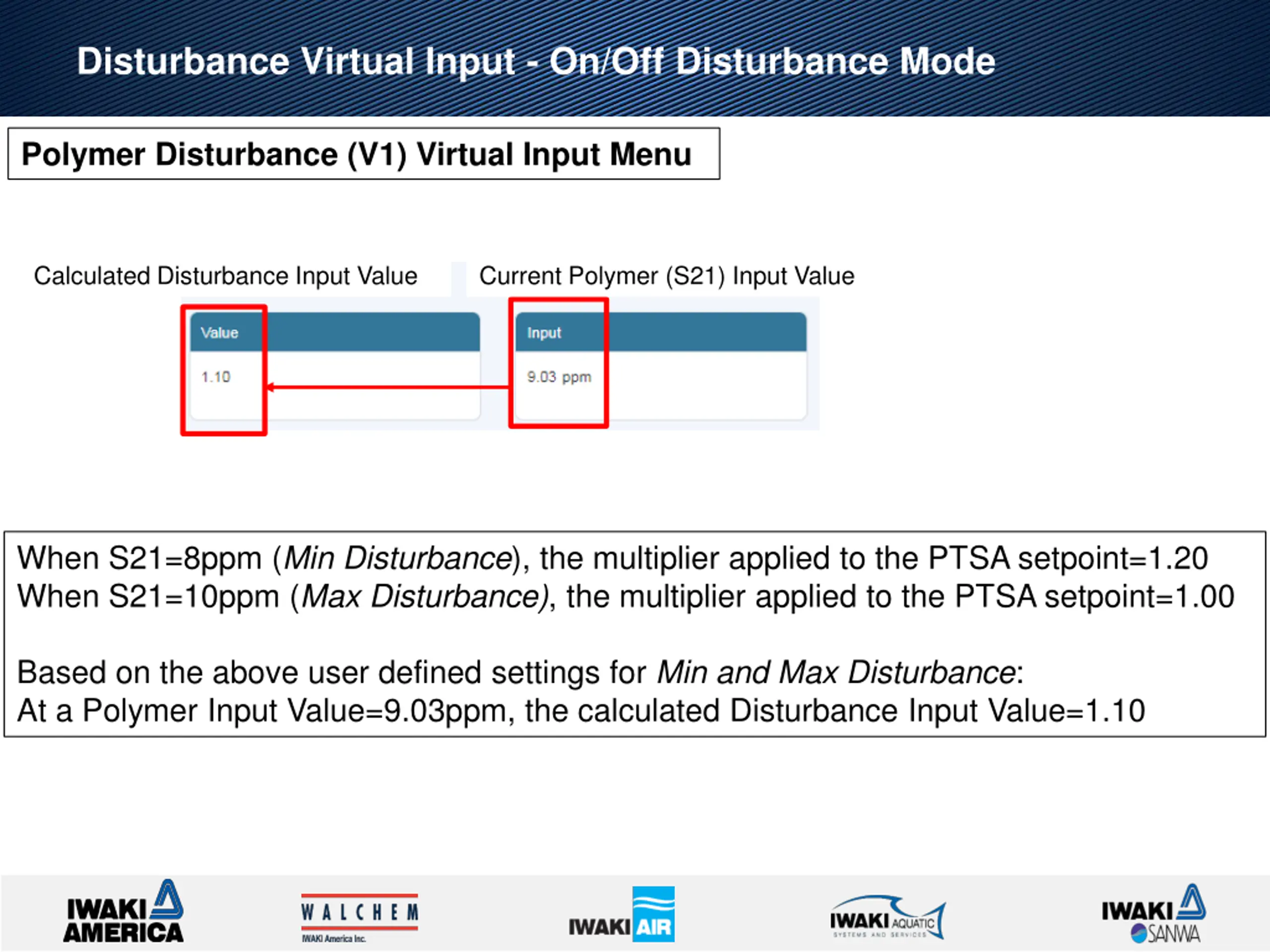 Disturbance Virtual Input - On/Off Disturbance Mode Polymer Disturbance (V1) Virtual Input These user defined programmed settings are used to calculate the Disturbance Value: When S21=8ppm (Min Disturbance), the multiplier applied to the PTSA setpoint=1.20 When S21=10ppm (Max Disturbance), the multiplier applied to the PTSA setpoint=1.00 You don t have to use the whole range of the input. You want to put in the lowest and highest polymer reading and how much you want to multiply the PTSA setpoint by at these extremes.