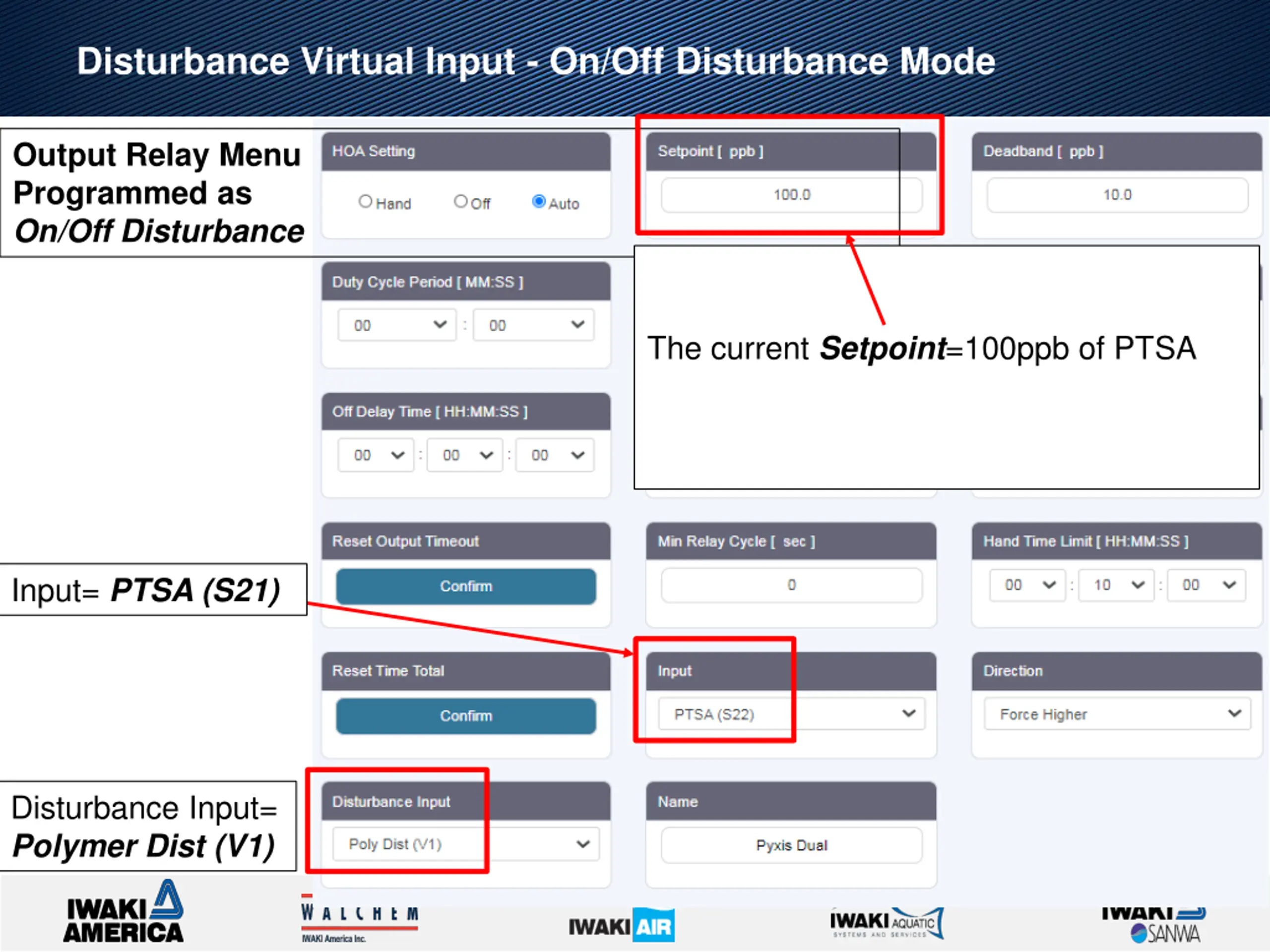 Disturbance Virtual Input - On/Off Disturbance Mode Output Relay Menu Programmed as On/Off Disturbance The current Setpoint=100ppb of PTSA Input= PTSA (S21) Disturbance Input= Polymer Dist (V1)