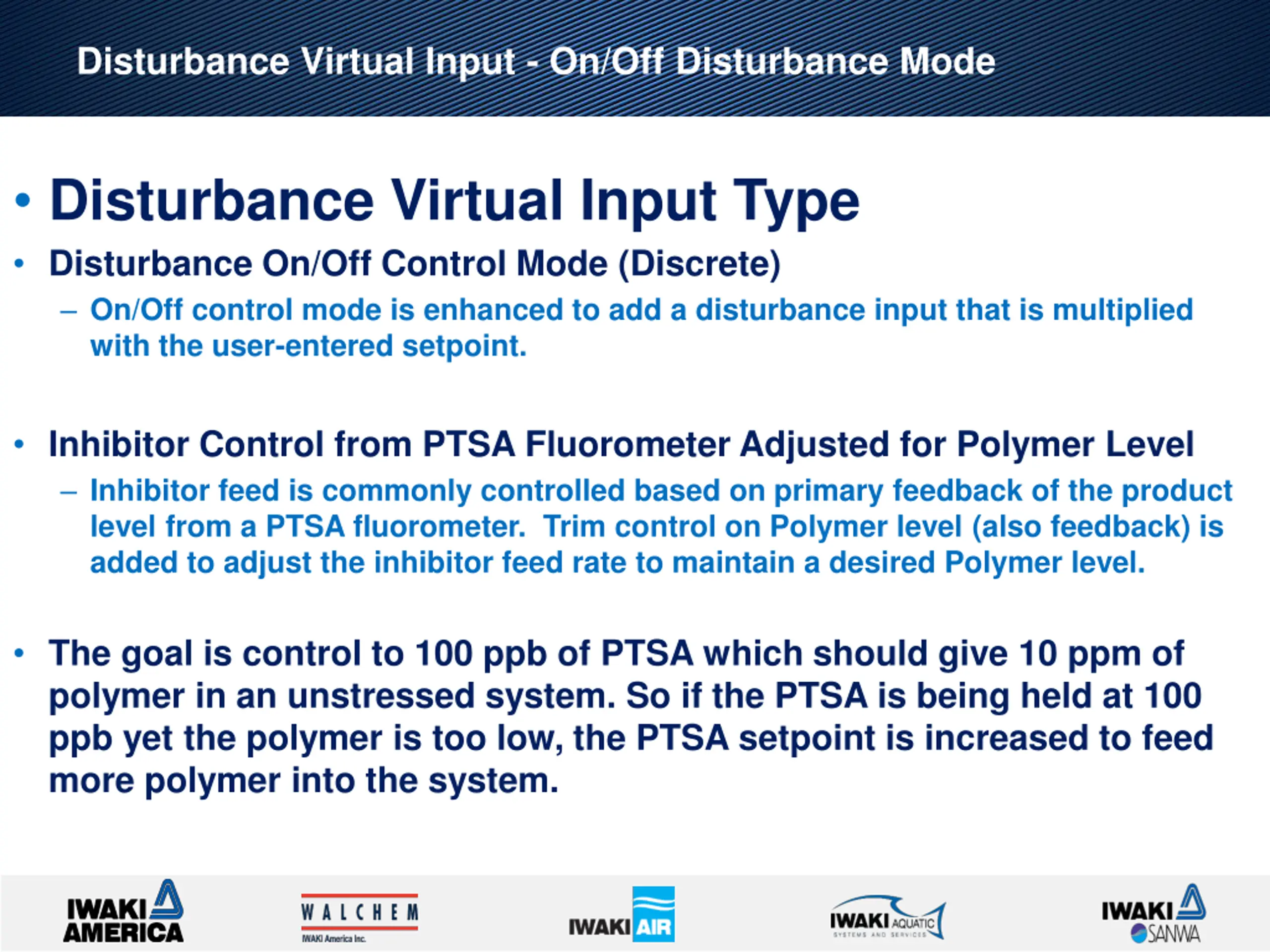Disturbance Virtual Input - On/Off Disturbance Mode Disturbance Virtual Input Type Disturbance On/Off Control Mode (Discrete) On/Off control mode is enhanced to add a disturbance input that is multiplied with the user-entered setpoint. Inhibitor Control from PTSA Fluorometer Adjusted for Polymer Level Inhibitor feed is commonly controlled based on primary feedback of the product level from a PTSA fluorometer. Trim control on Polymer level (also feedback) is added to adjust the inhibitor feed rate to maintain a desired Polymer level. The goal is control to 100 ppb of PTSA which should give 10 ppm of polymer in an unstressed system. So if the PTSA is being held at 100 ppb yet the polymer is too low, the PTSA setpoint is increased to feed more polymer into the system.