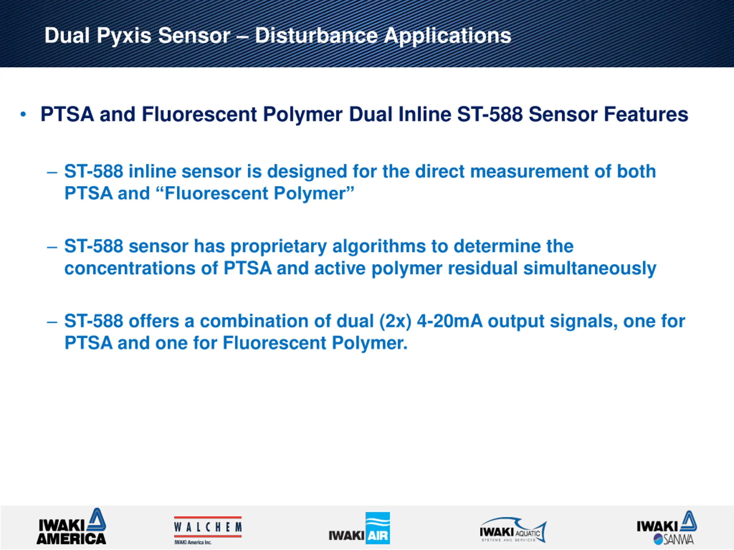 Dual Pyxis Sensor Disturbance Applications PTSA and Fluorescent Polymer Dual Inline ST-588 Sensor Features ST-588 inline sensor is designed for the direct measurement of both PTSA and Fluorescent Polymer ST-588 sensor has proprietary algorithms to determine the concentrations of PTSA and active polymer residual simultaneously ST-588 offers a combination of dual (2x) 4-20mA output signals, one for PTSA and one for Fluorescent Polymer.