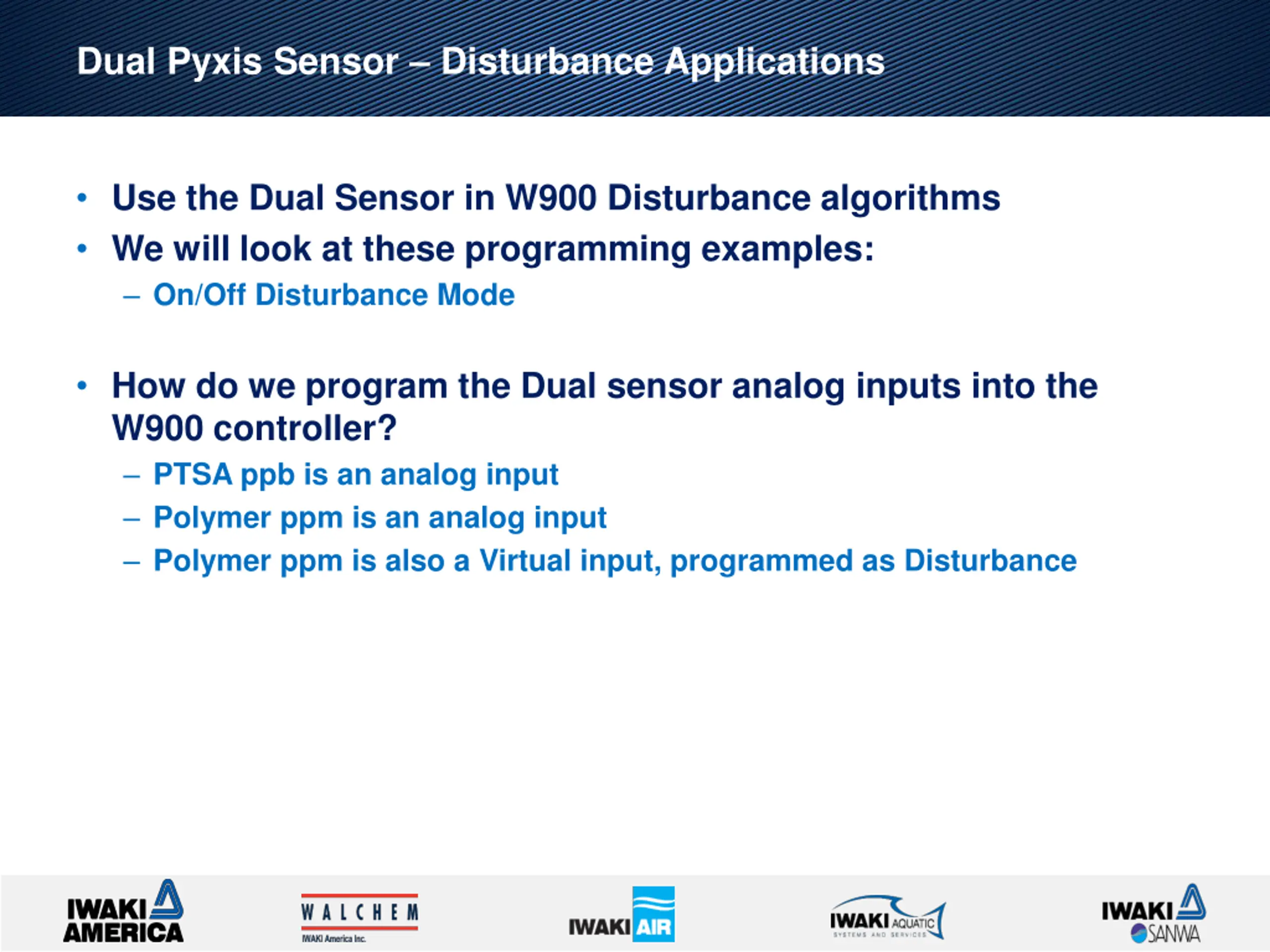 Dual Pyxis Sensor Disturbance Applications Use the Dual Sensor in W900 Disturbance algorithms We will look at these programming examples: On/Off Disturbance Mode How do we program the Dual sensor analog inputs into the W900 controller? PTSA ppb is an analog input Polymer ppm is an analog input Polymer ppm is also a Virtual input, programmed as Disturbance