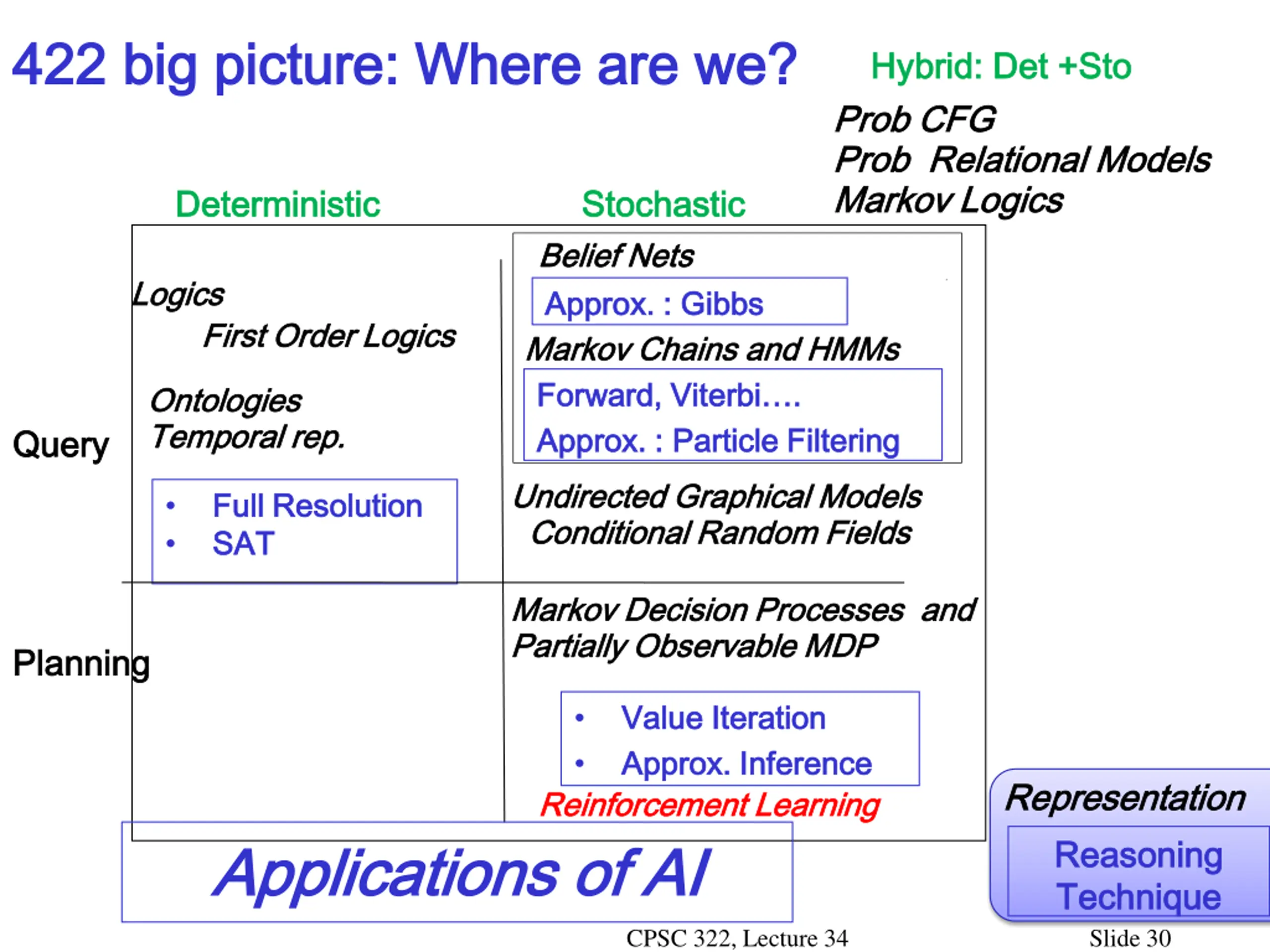 422 422 big big picture: Where are we? picture: Where are we? Hybrid: Hybrid: Det Det + +Sto Sto Prob Prob CFG CFG Prob Prob Relational Relational M Models Markov Logics Markov Logics odels Deterministic Deterministic Stochastic Stochastic Belief Nets Belief Nets Approx. : Gibbs Approx. : Gibbs Logics Logics First Order Logics First Order Logics Markov Chains and HMMs Markov Chains and HMMs Forward, Viterbi . Forward, Viterbi . Approx. : Particle Filtering Approx. : Particle Filtering Ontologies Ontologies Temporal rep. Temporal rep. Query Query Undirected Graphical Models Undirected Graphical Models Conditional Conditional R Random Fields andom Fields Full Resolution Full Resolution SAT SAT Markov Decision Processes and Markov Decision Processes and Partially Partially Observable MDP Observable MDP Planning Planning Value Iteration Value Iteration Approx. Inference Approx. Inference Reinforcement Learning Reinforcement Learning Representation Representation Reasoning Reasoning Technique Technique Slide 30 Applications of AI Applications of AI CPSC 322, Lecture 34
