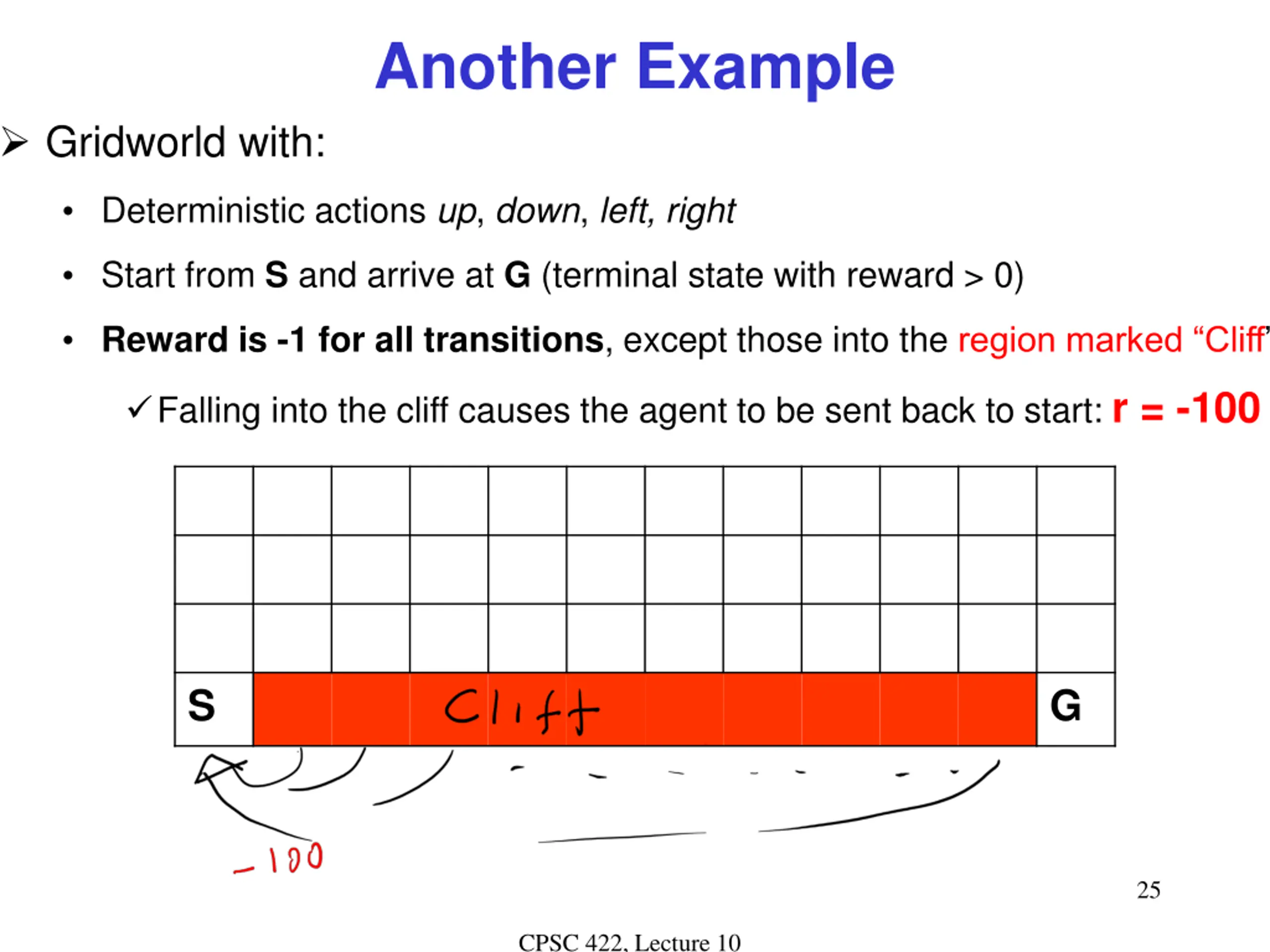 Another Example Gridworld with: Deterministic actions up, down, left,right Start from S and arrive at G (terminal state with reward > 0) Reward is -1 for all transitions, except those into the region marked Cliff Falling into the cliff causes the agent to be sent back to start: r = -100 S G 25 CPSC 422, Lecture 10