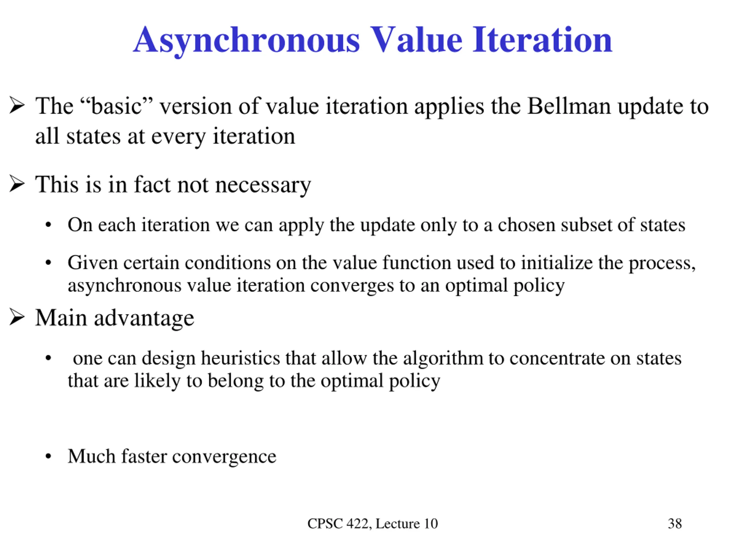 Asynchronous Value Iteration The basic version of value iteration applies the Bellman update to all states at every iteration This is in fact not necessary On each iteration we can apply the update only to a chosen subset of states Given certain conditions on the value function used to initialize the process, asynchronous value iteration converges to an optimal policy Main advantage one can design heuristics that allow the algorithm to concentrate on states that are likely to belong to the optimal policy Much faster convergence CPSC 422, Lecture 10 38