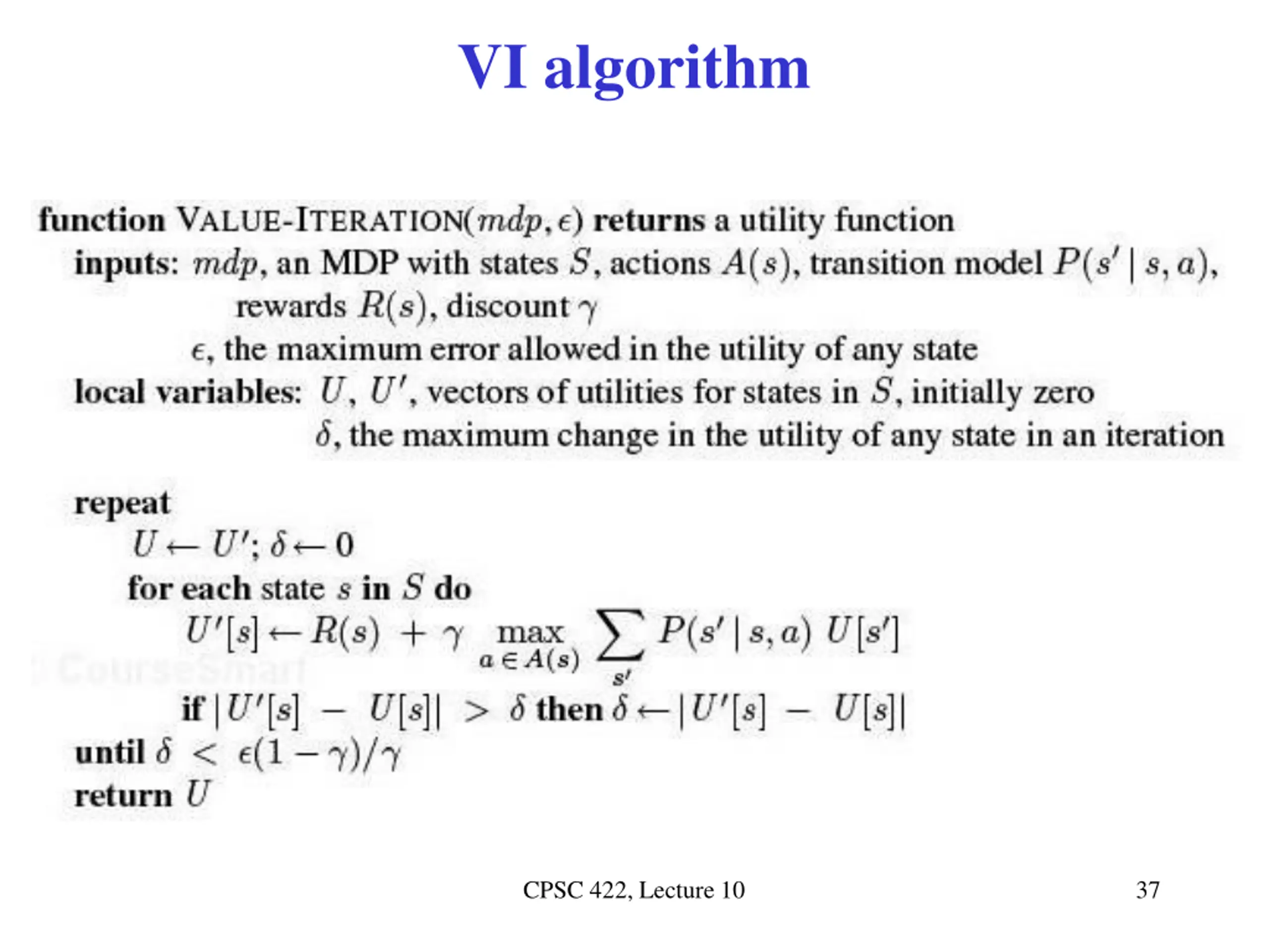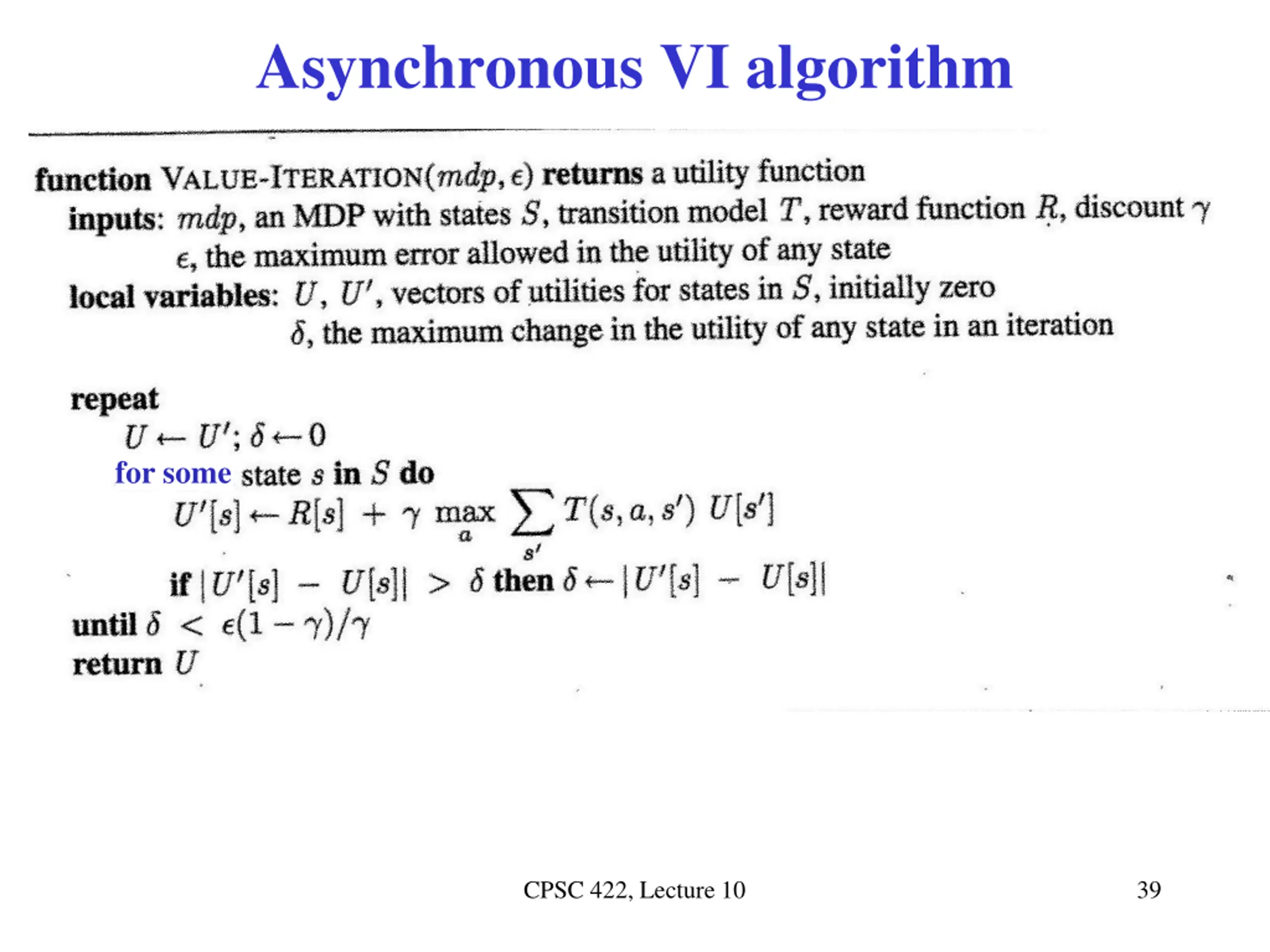 Asynchronous VI algorithm for some CPSC 422, Lecture 10 39