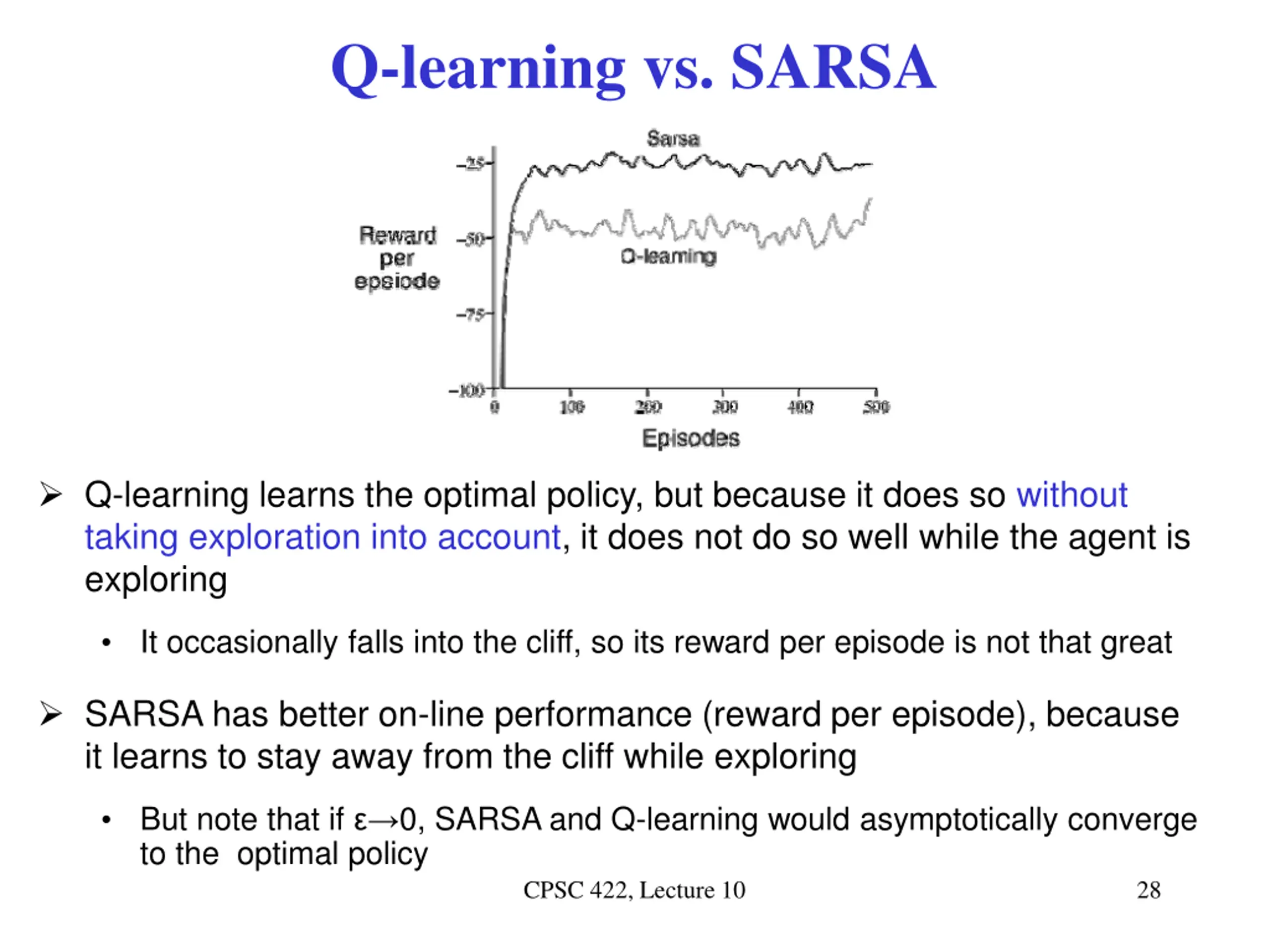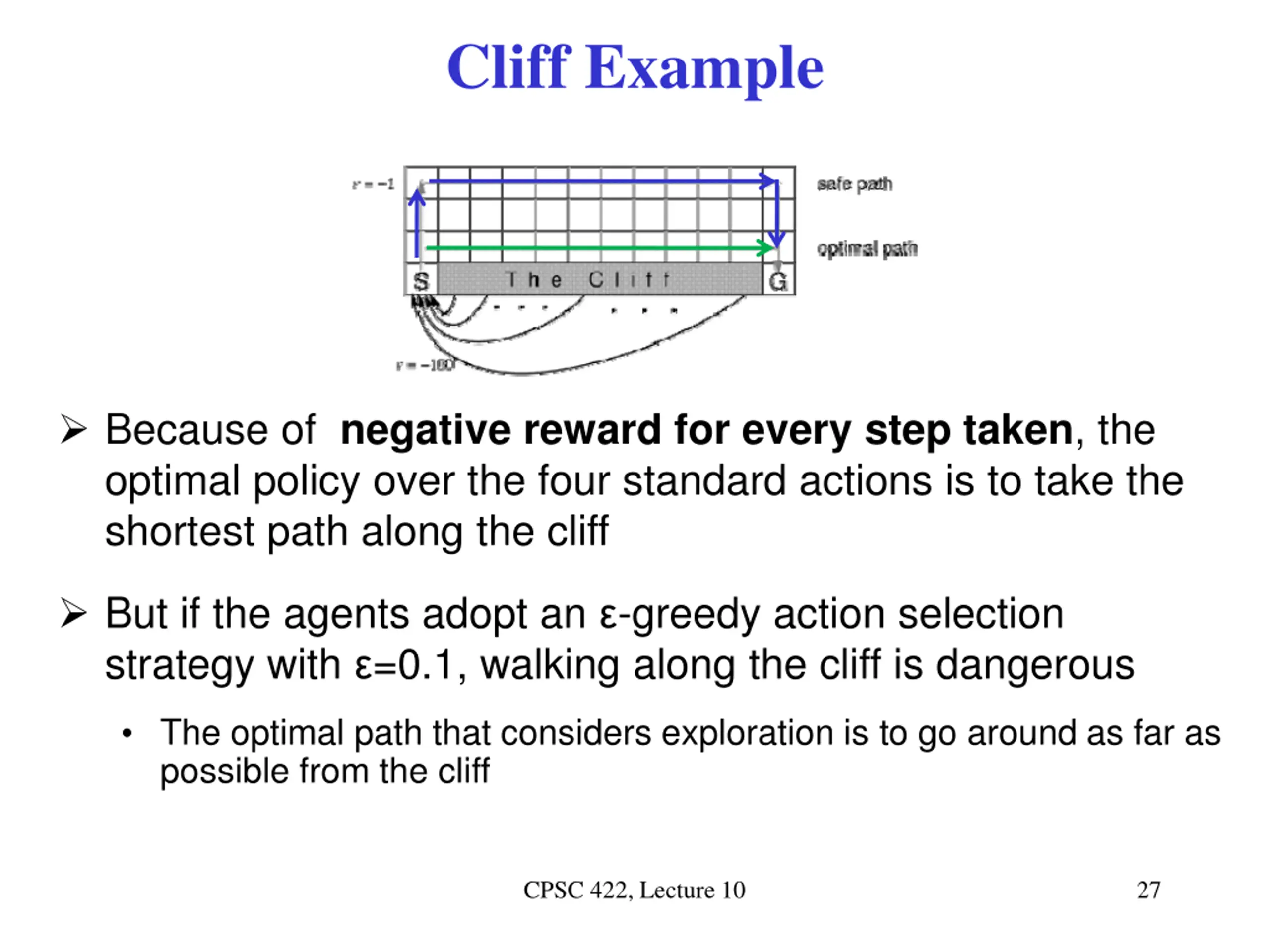 Cliff Example Because of negative reward for every step taken, the optimal policy over the four standard actions is to take the shortest path along the cliff But if the agents adopt an -greedy action selection strategy with =0.1, walking along the cliff is dangerous The optimal path that considers exploration is to go around as far as possible from the cliff CPSC 422, Lecture 10 27