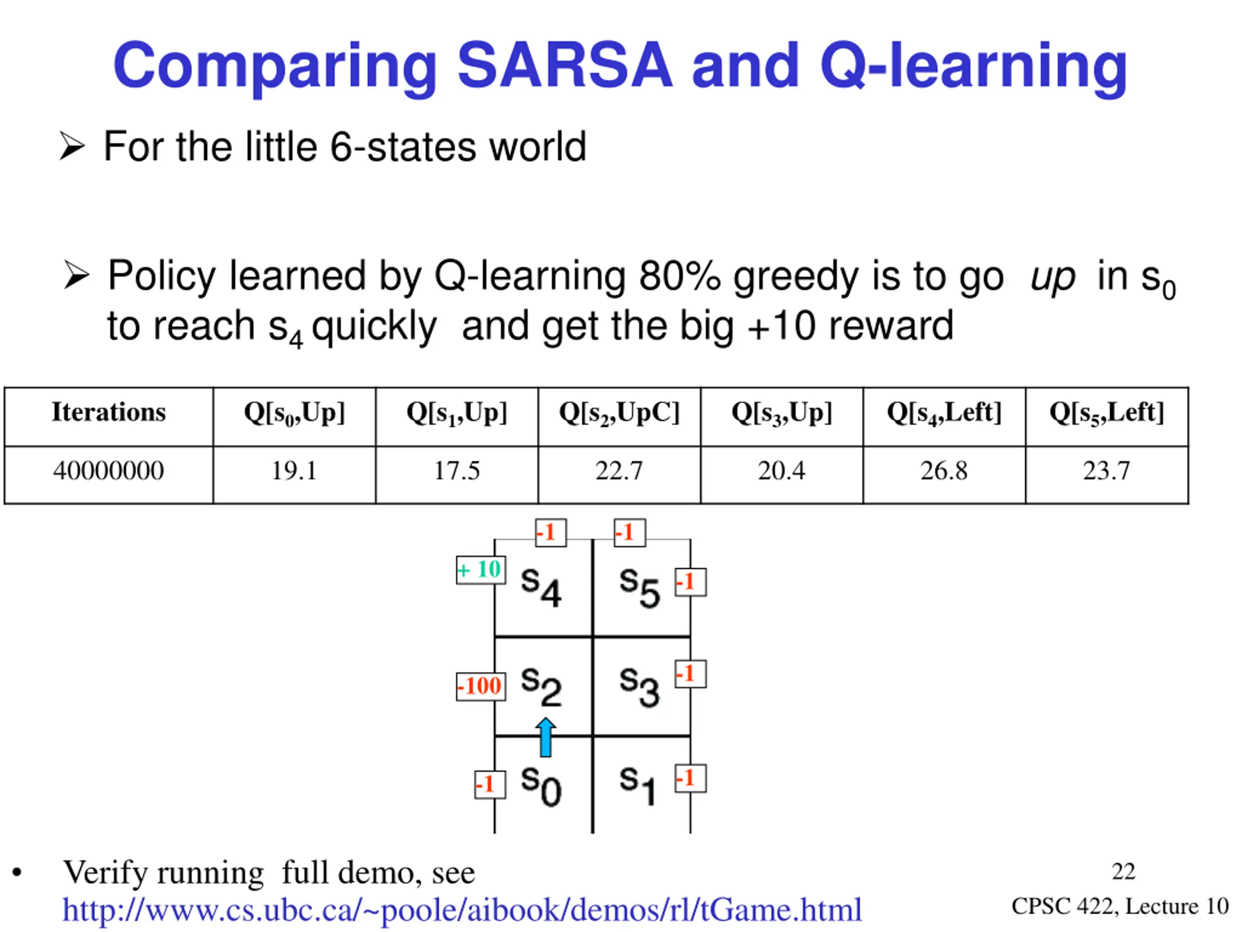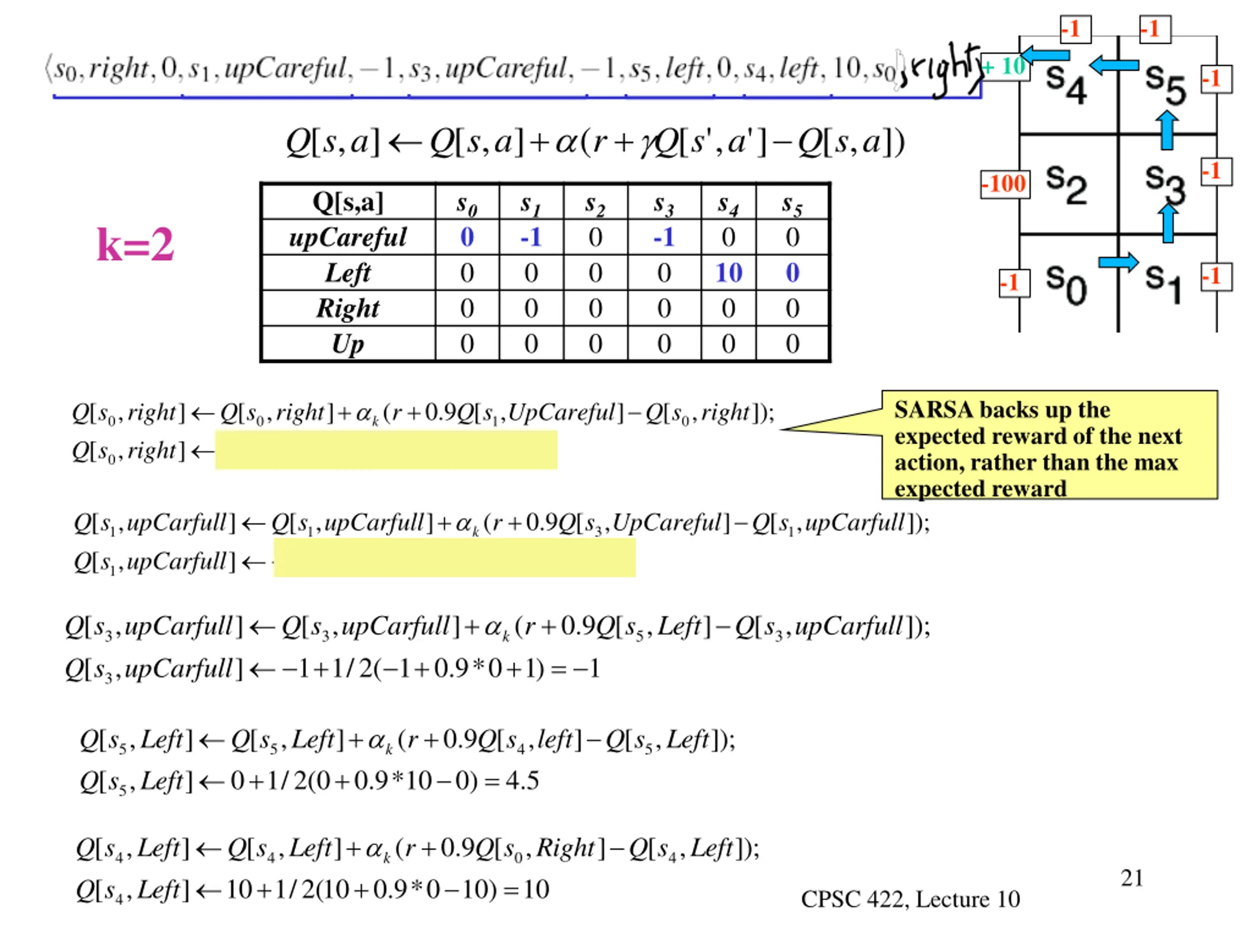-1 -1 + 10 -1 + + [ , ] [ , ] ( [ , ' s ] ' a [ , ]) Q s a Q s a r Q Q s a -1 -100 s0 0 0 0 0 s1 -1 0 0 0 s2 0 0 0 0 s3 -1 0 0 0 s4 0 10 0 0 s5 0 0 0 0 Q[s,a] upCareful Left Right Up k=1 k=2 -1 -1 SARSA backs up the expected reward of the next action, rather than the max expected reward + 9 . 0 + [ , ] [ , ] ( [ = , ] [ , ]); Q s right Q s right r Q s UpCareful Q s right 0 0 1 0 k / 1 + 9 . 0 + ) 1 ) 0 9 . 0 [ , ] 0 0 ( 2 * ( Q s right 0 + 9 . 0 + [ , ] [ , ] ( [ , ] [ , ]); Q s upCarfull Q s upCarfull r Q s UpCareful Q s upCarfull 1 1 3 1 k / 1 + 9 . 0 + ) 1 ) 1 + = . 1 [ , ] 1 ( 2 1 * ( 45 Q s upCarfull 1 + + [ , ] [ , ] ( 9 . 0 = [ , ] [ , ]); Q s upCarfull Q s upCarfull r Q s Left Q s upCarfull 3 3 5 3 k / 1 + 9 . 0 + ) 1 + [ , ] 1 ( 2 1 * 0 1 Q s upCarfull 3 + 9 . 0 + [ , ] [ , ] ( [ , ] [ , ]); Q s Left Q s Left r Q s left Q s Left 5 5 4 5 k / 1 + 9 . 0 + ) 0 = [ , ] 0 0 ( 2 * 10 5 . 4 Q s Left 5 + + [ , ] [ , ] ( 9 . 0 [ , ] [ , ]); Q s Left Q s Left r Q s Right Q s Left 4 4 0 4 k 21 / 1 + 9 . 0 + = [ , ] 10 ( 2 10 * 0 10 ) 10 Q s Left CPSC 422, Lecture 10 4