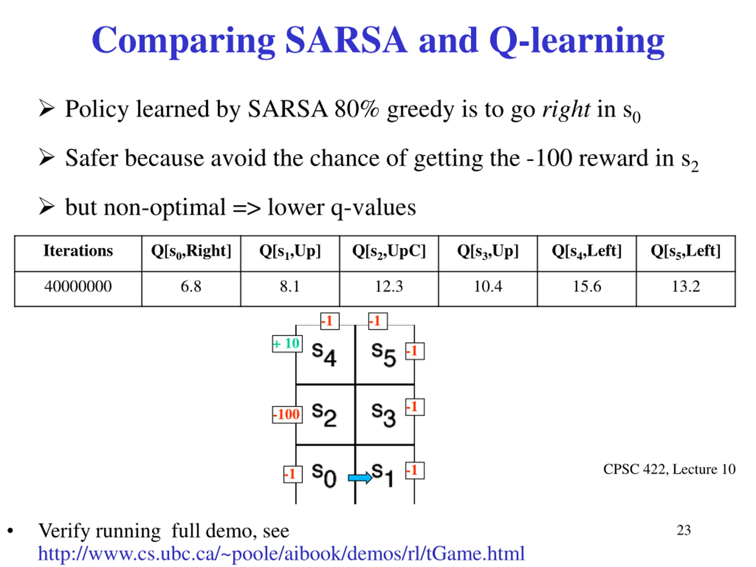 Comparing SARSA and Q-learning Policy learned by SARSA 80% greedy is to go right in s0 Safer because avoid the chance of getting the -100 reward in s2 but non-optimal => lower q-values Iterations Q[s0,Right] Q[s1,Up] Q[s2,UpC] Q[s3,Up] Q[s4,Left] Q[s5,Left] 40000000 6.8 8.1 12.3 10.4 15.6 13.2 -1 -1 + 10 -1 -1 -100 CPSC 422, Lecture 10 -1 -1 Verify running full demo, see http://www.cs.ubc.ca/~poole/aibook/demos/rl/tGame.html 23