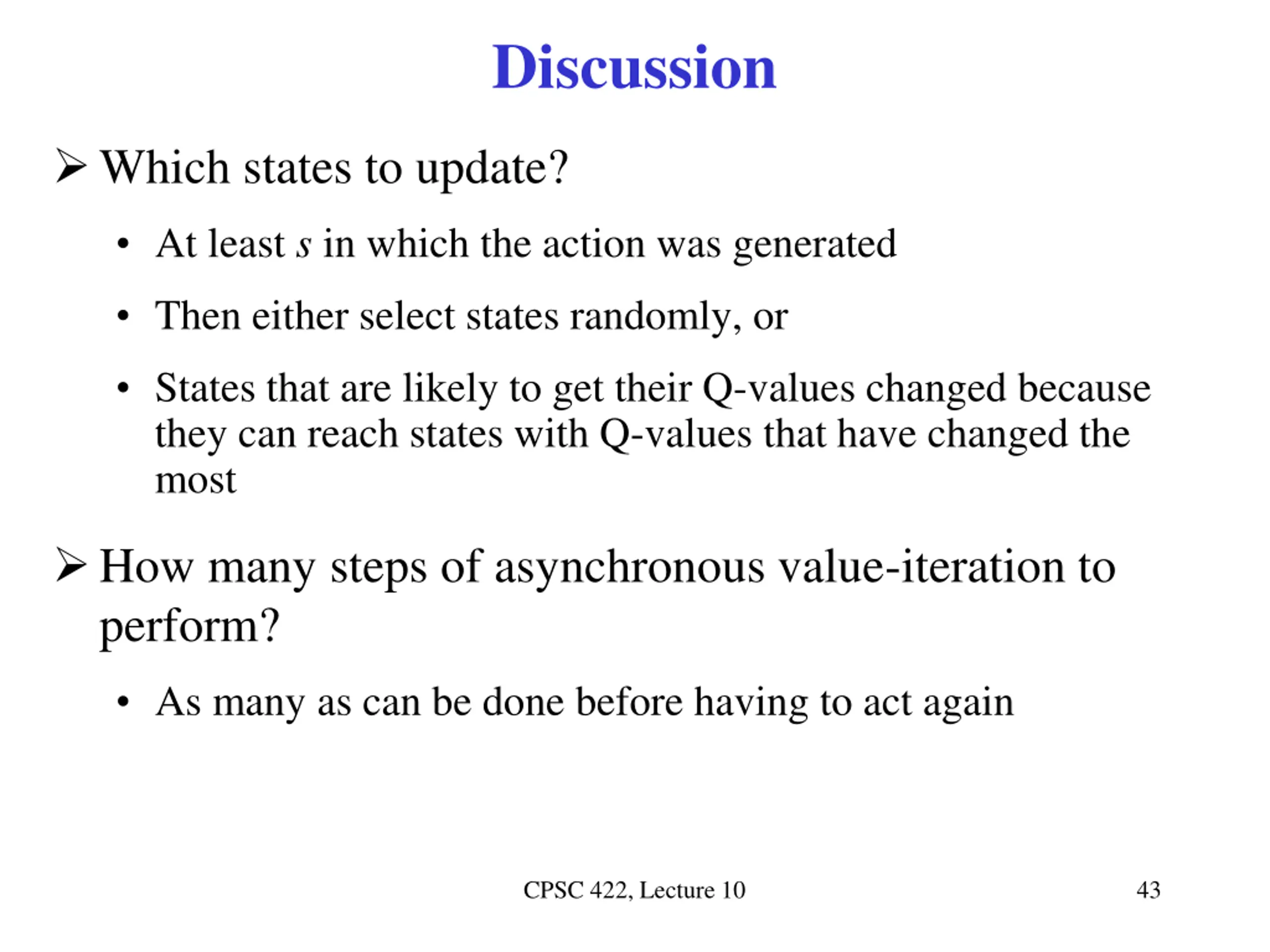 Discussion Which states to update? At least s in which the action was generated Then either select states randomly, or States that are likely to get their Q-values changed because they can reach states with Q-values that have changed the most How many steps of asynchronous value-iteration to perform? As many as can be done before having to act again CPSC 422, Lecture 10 43
