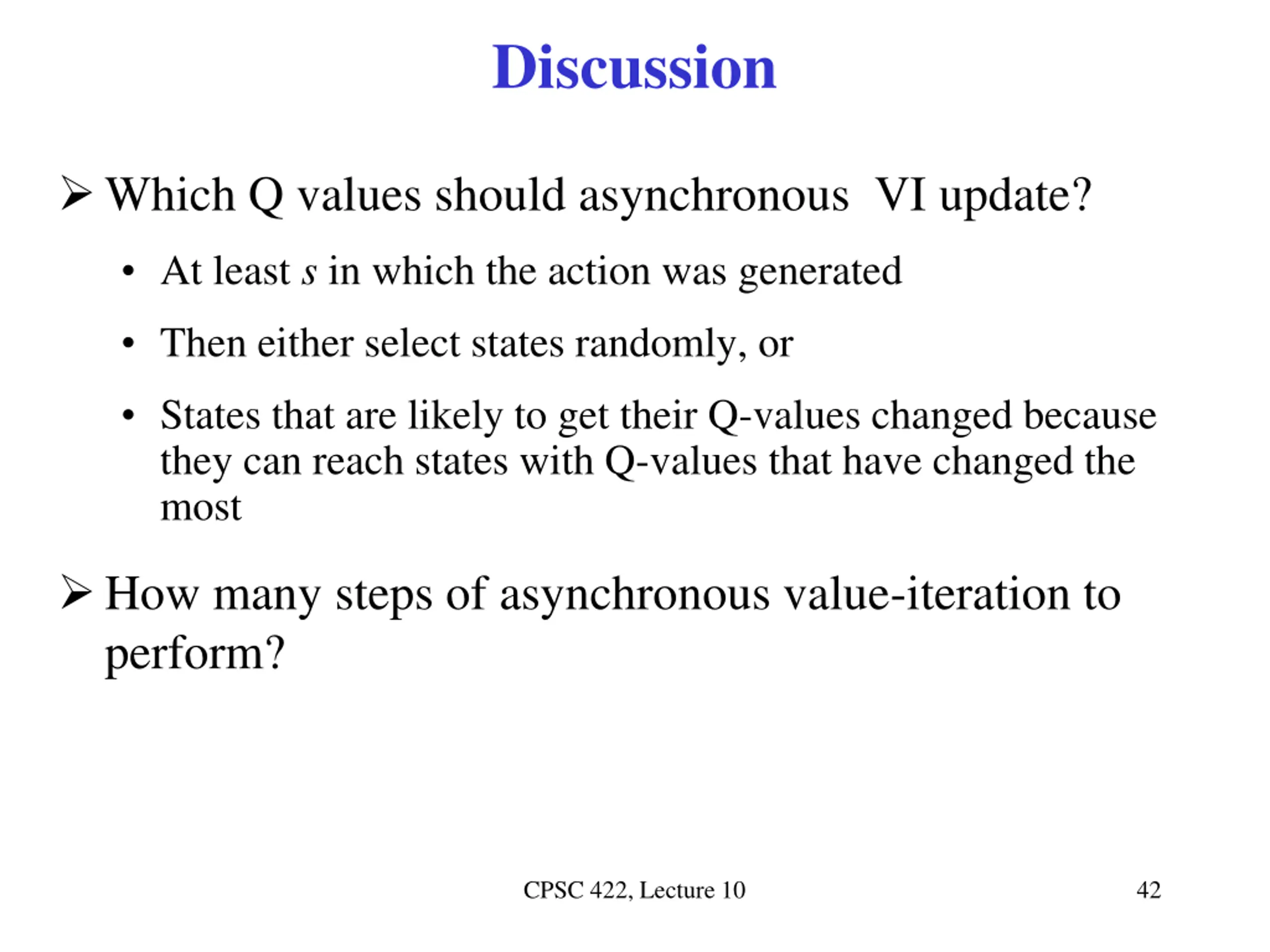 Discussion Which Q values should asynchronous VI update? At least s in which the action was generated Then either select states randomly, or States that are likely to get their Q-values changed because they can reach states with Q-values that have changed the most How many steps of asynchronous value-iteration to perform? CPSC 422, Lecture 10 42
