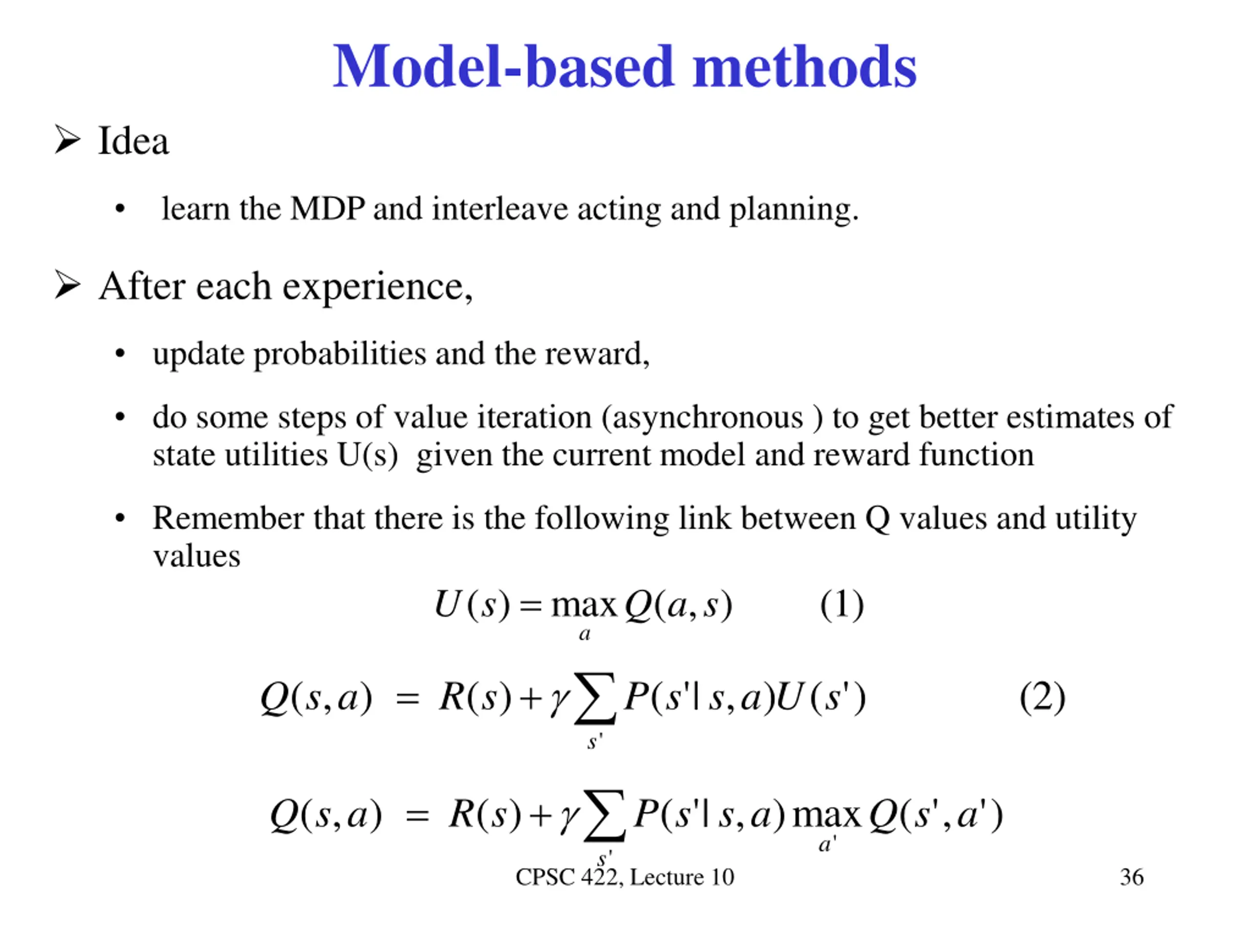 Model-based methods Idea learn the MDP and interleave acting and planning. After each experience, update probabilities and the reward, do some steps of value iteration (asynchronous ) to get better estimates of state utilities U(s) given the current model and reward function Remember that there is the following link between Q values and utility values max ) ( Q s U a ' s ' s CPSC 422, Lecture 10 = ( , ) (1) a s = + ( , ) ( ) ( | ' s , ) ( ) ' s (2) Q s a R s P s a U = + ( , ) ( ) ( | ' s , ) max a ( , ' s ) ' a Q s a R s P s a Q ' 36