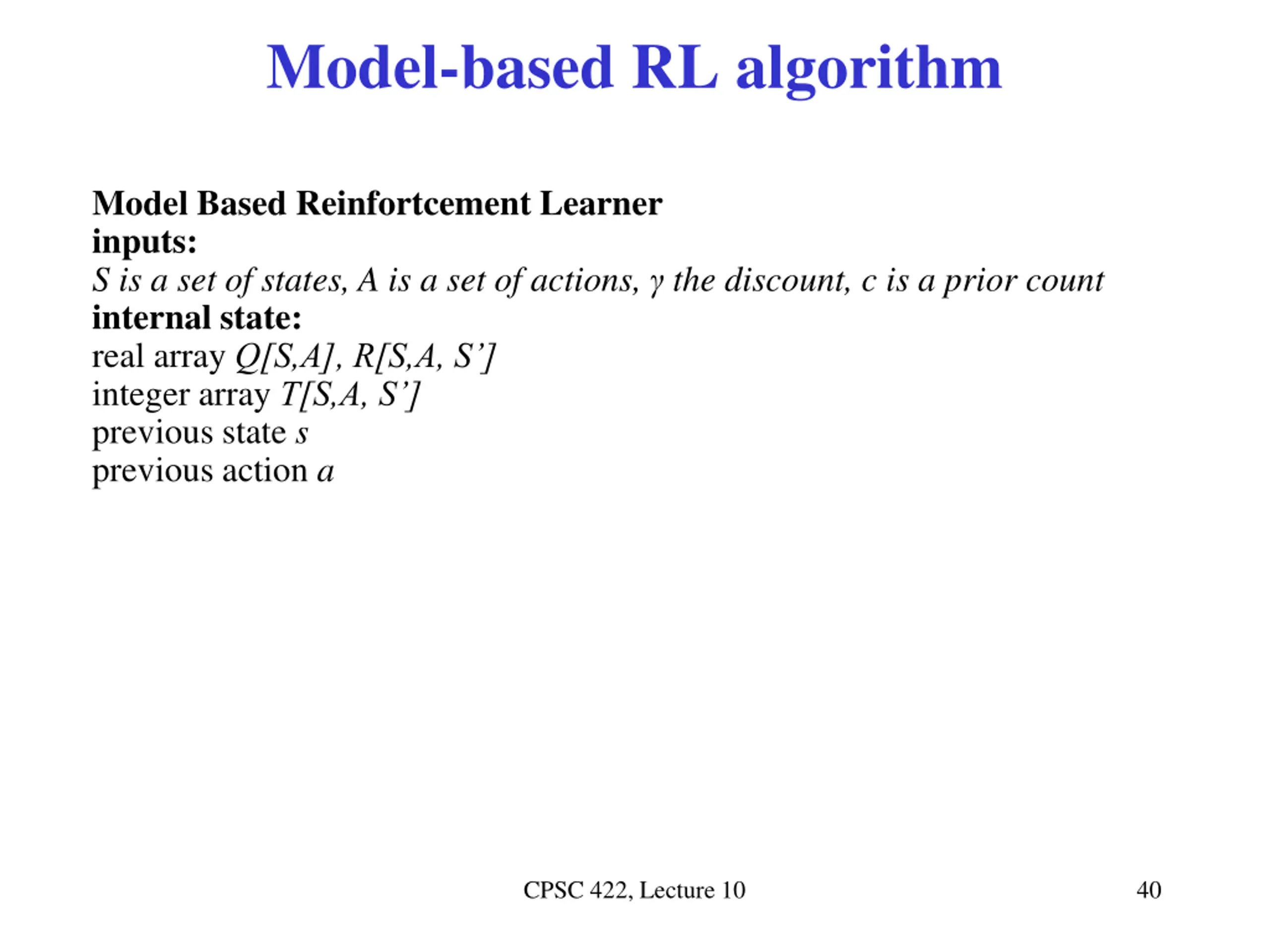Model-based RL algorithm Model Based Reinfortcement Learner inputs: S is a set of states, A is a set of actions, the discount, c is a prior count internal state: real array Q[S,A], R[S,A, S ] integer array T[S,A, S ] previous state s previous action a CPSC 422, Lecture 10 40