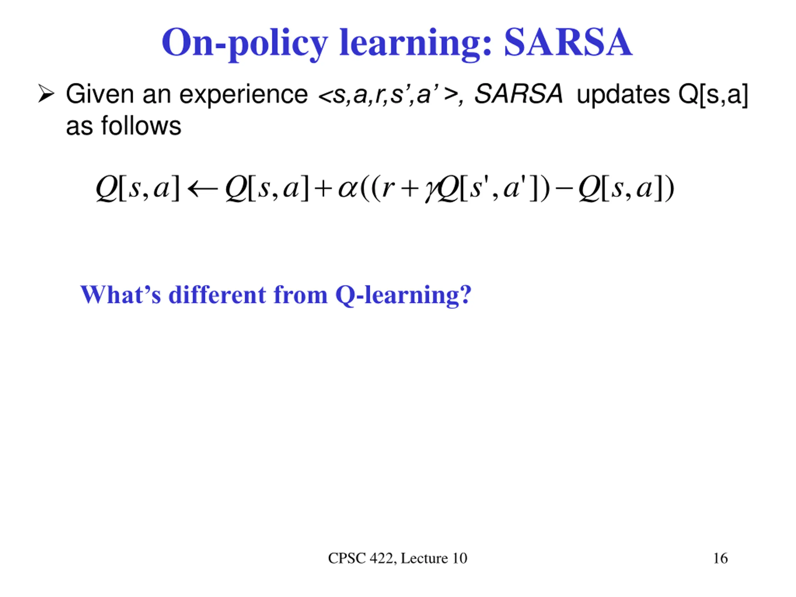On-policy learning: SARSA On-policy learning learns the value of the policy being followed. e.g., act greedily 80% of the time and act randomly 20% of the time Better to be aware of the consequences of exploration has it happens, and avoid outcomes that are too costly while acting, rather than looking for the true optimal policy SARSA So called because it uses <state, action, reward, state, action> experiences rather than the <state, action, reward, state> used by Q-learning Instead of looking for the best action at every step, it evaluates the actions suggested by the current policy Uses this info to revise it CPSC 422, Lecture 10 15