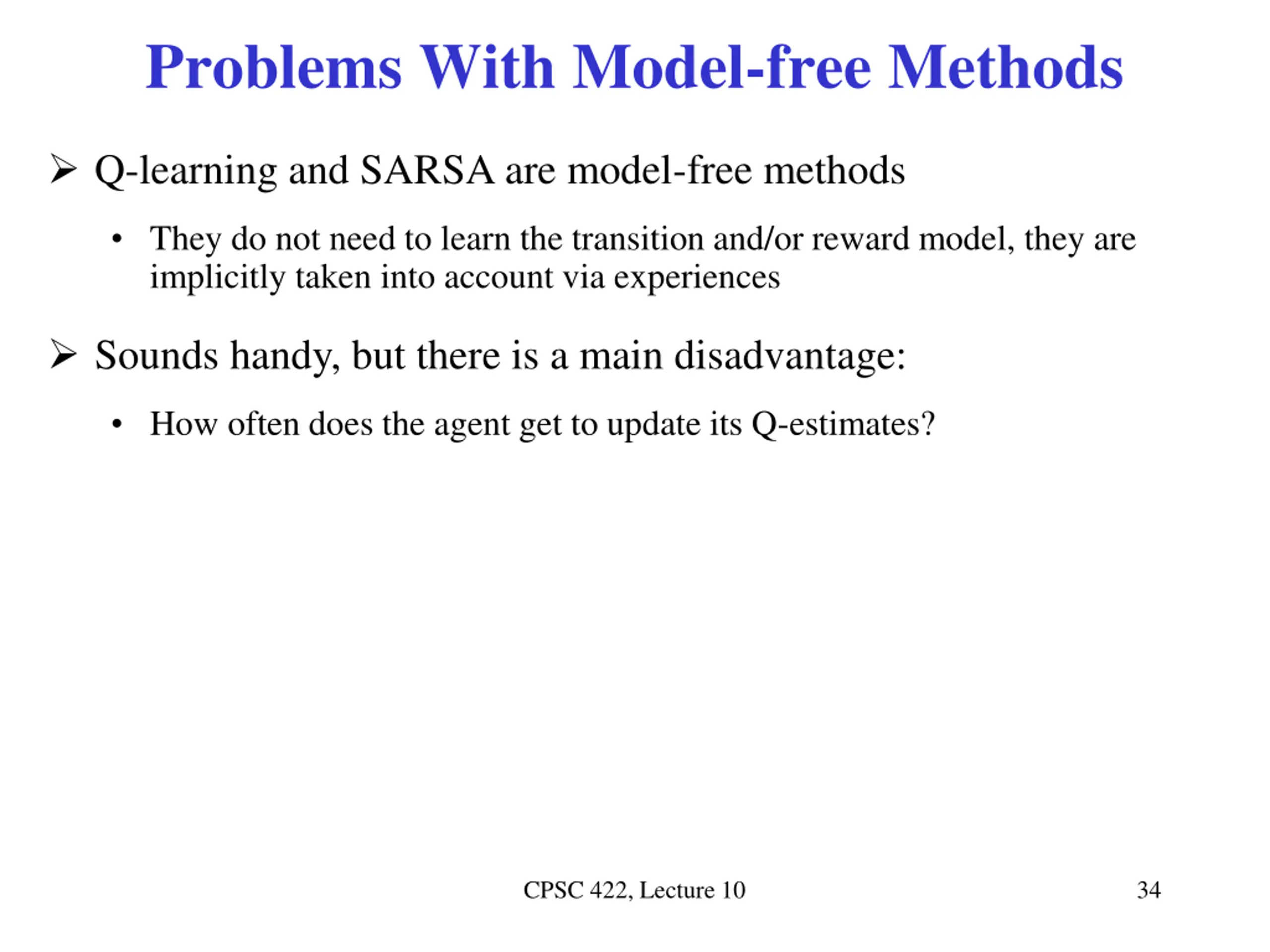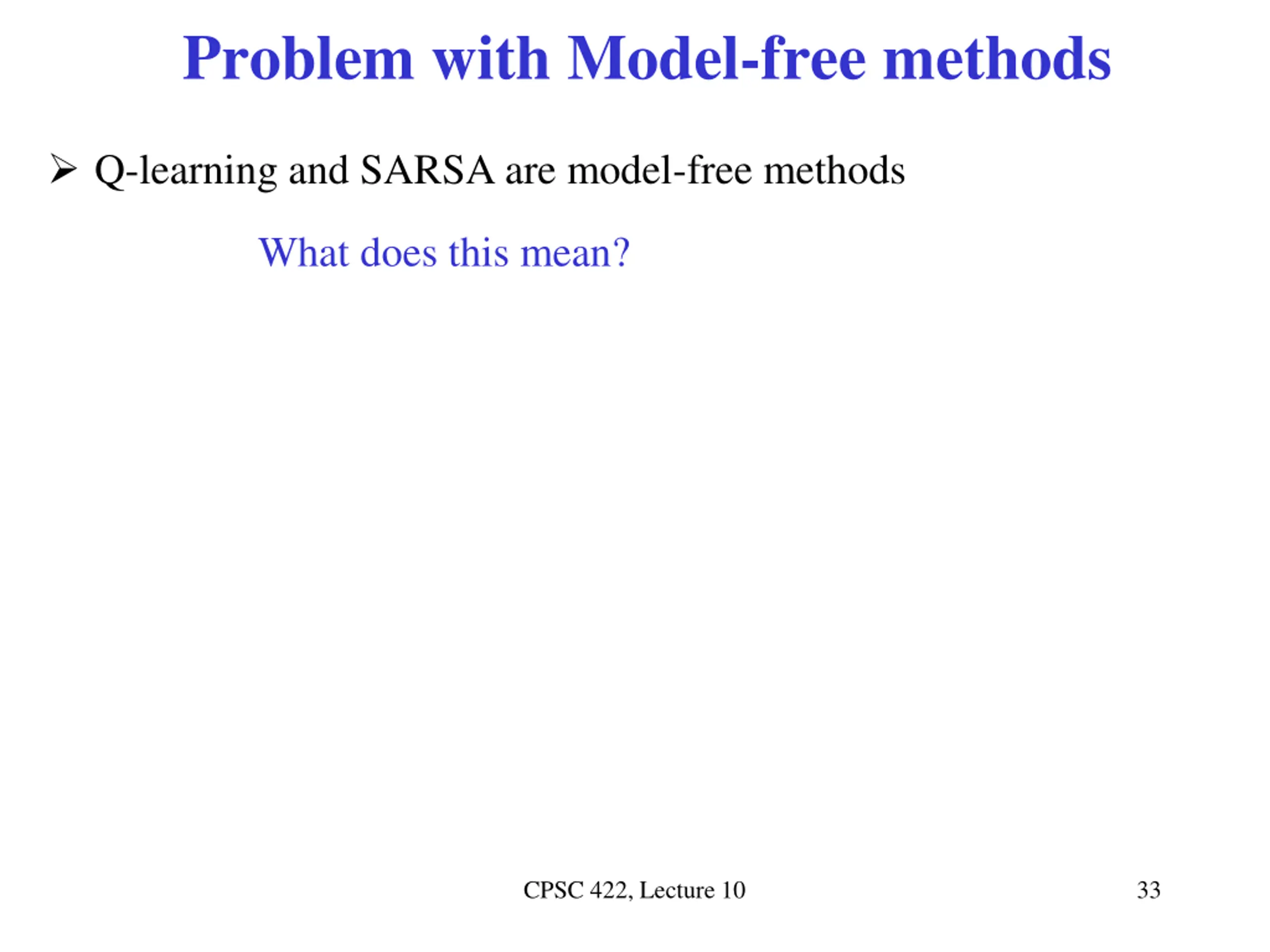 Problem with Model-free methods Q-learning and SARSA are model-free methods What does this mean? CPSC 422, Lecture 10 33