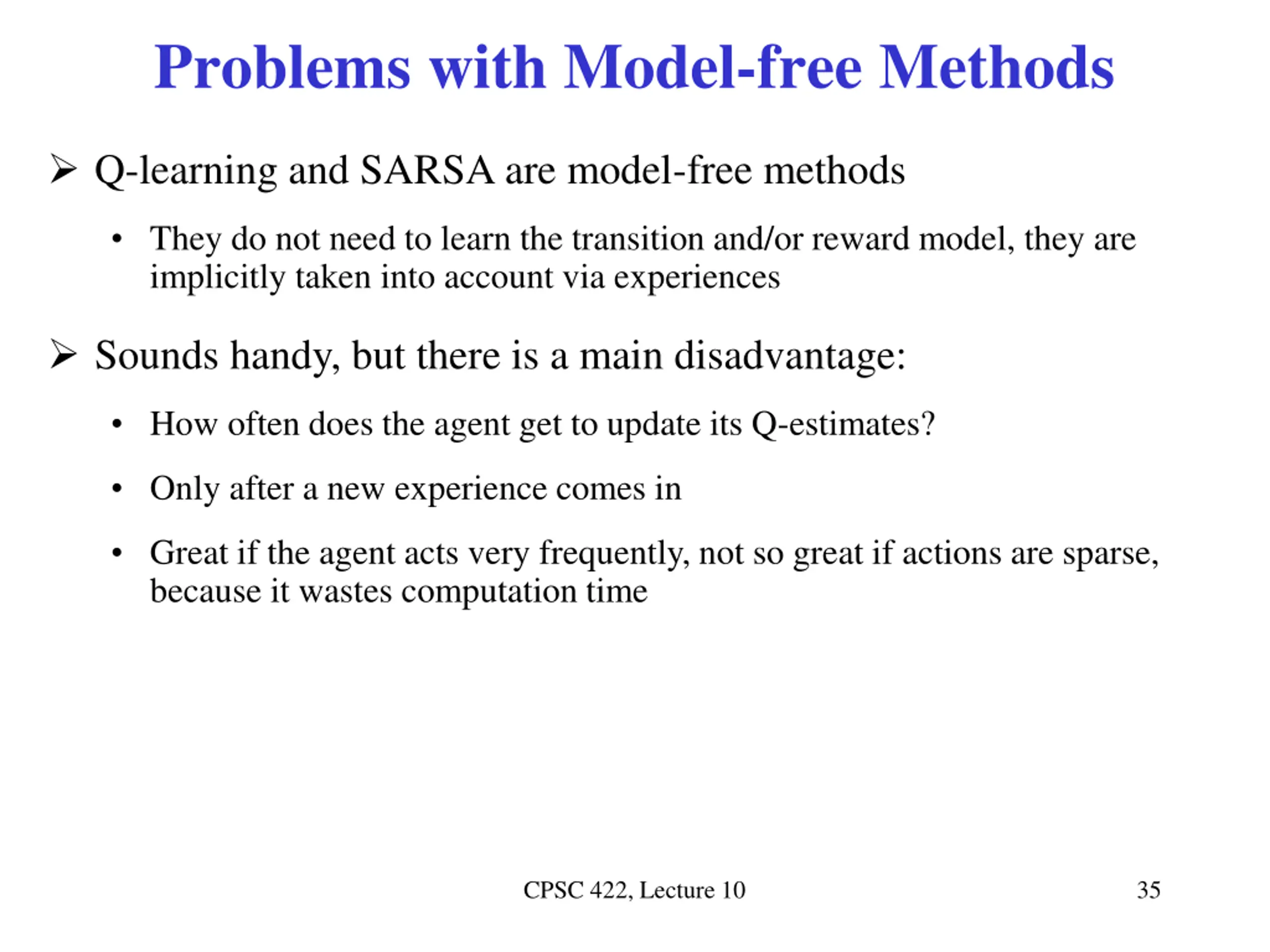 Problems With Model-free Methods Q-learning and SARSA are model-free methods They do not need to learn the transition and/or reward model, they are implicitly taken into account via experiences Sounds handy, but there is a main disadvantage: How often does the agent get to update its Q-estimates? CPSC 422, Lecture 10 34