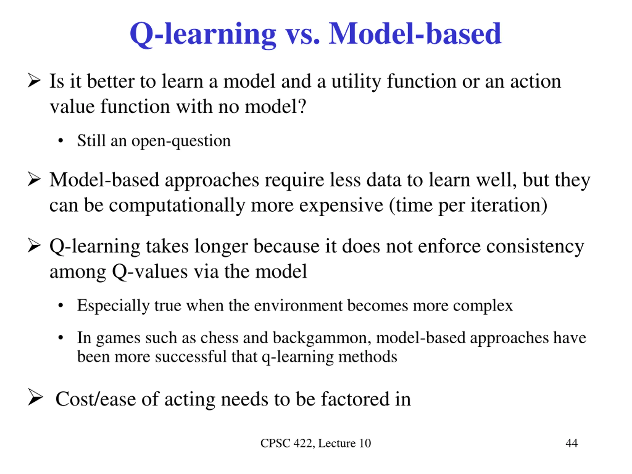Q-learning vs. Model-based Is it better to learn a model and a utility function or an action value function with no model? Still an open-question Model-based approaches require less data to learn well, but they can be computationally more expensive (time per iteration) Q-learning takes longer because it does not enforce consistency among Q-values via the model Especially true when the environment becomes more complex In games such as chess and backgammon, model-based approaches have been more successful that q-learning methods Cost/ease of acting needs to be factored in CPSC 422, Lecture 10 44