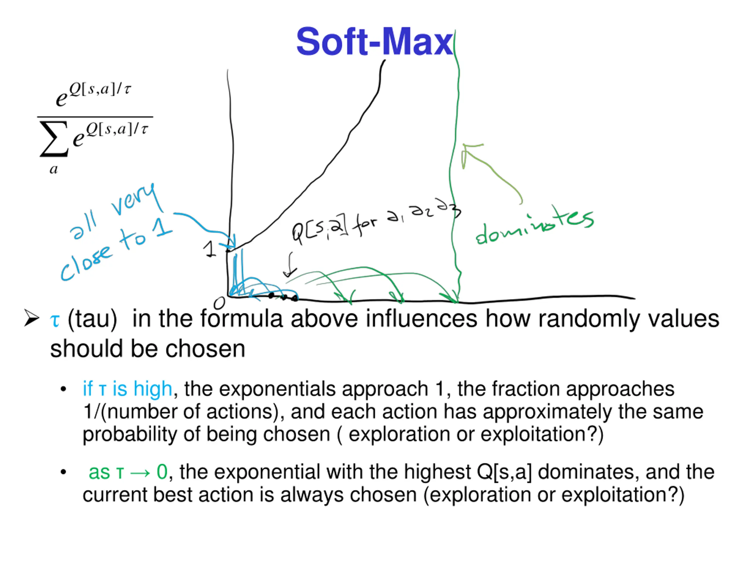 Soft-Max [ , / ] a Q s e a [ , / ] a Q s e (tau) in the formula above influences how randomly values should be chosen if is high, the exponentials approach 1, the fraction approaches 1/(number of actions), and each action has approximately the same probability of being chosen ( exploration or exploitation?) as 0, the exponential with the highest Q[s,a] dominates, and the current best action is always chosen (exploration or exploitation?) CPSC 422, Lecture 10 10