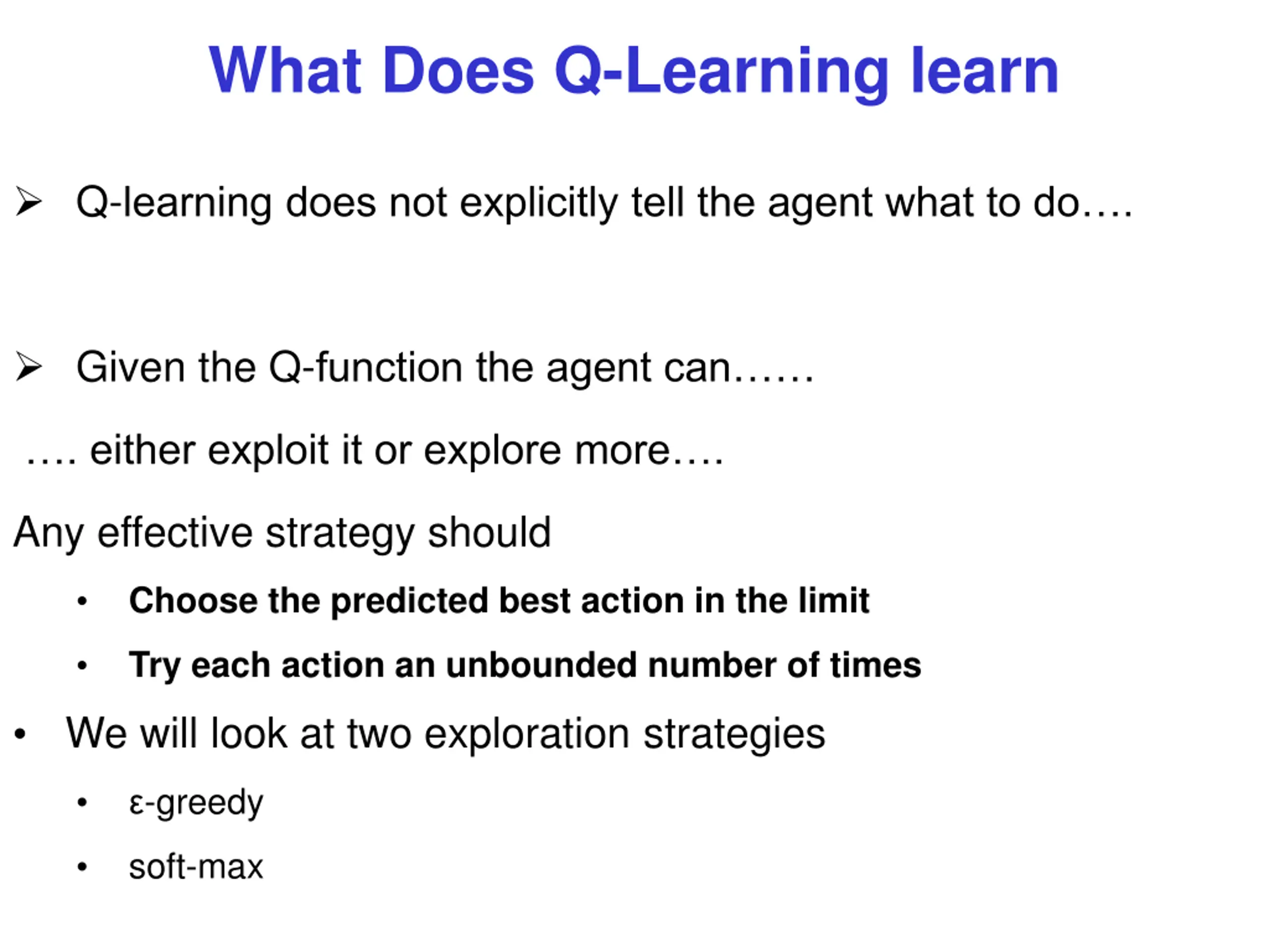 What Does Q-Learning learn Q-learning does not explicitly tell the agent what to do . Given the Q-function the agent can . either exploit it or explore more . Any effective strategy should Choose the predicted best action in the limit Try each action an unbounded number of times We will look at two exploration strategies -greedy soft-max CPSC 422, Lecture 10 5