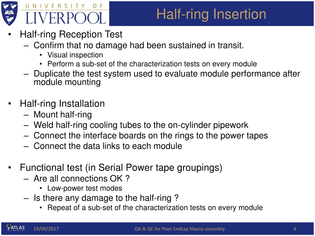Half-ring Insertion Half-ring Reception Test Confirm that no damage had been sustained in transit. Visual inspection Perform a sub-set of the characterization tests on every module Duplicate the test system used to evaluate module performance after module mounting Half-ring Installation Mount half-ring Weld half-ring cooling tubes to the on-cylinder pipework Connect the interface boards on the rings to the power tapes Connect the data links to each module Functional test (in Serial Power tape groupings) Are all connections OK ? Low-power test modes Is there any damage to the half-ring ? Repeat of a sub-set of the characterization tests on every module 19/09/2017 QA & QC for Pixel Endcap Macro-assembly 4