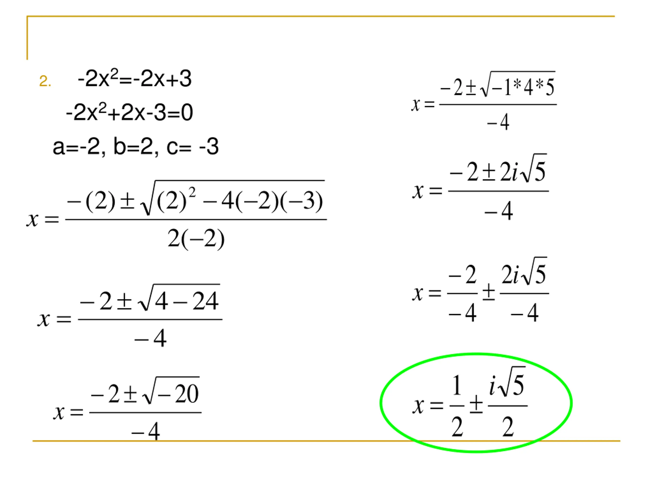 -2x2=-2x+3 * 1 2. -2x2+2x-3=0 a=-2, b=2, c= -3 2 4 * 5 = x 4 2 2 5 i = x ) 2 ( ( 4 ) 3 2 ) 2 ( 2 )( 4 = x ) 2 ( 2 2 2 5 i = x 2 4 24 4 4 = x 4 1 5 i 2 20 = x = x 2 2 4