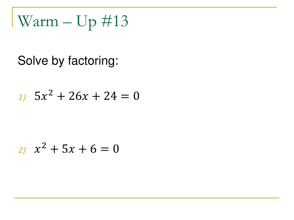 Warm Up #13 Solve by factoring: 1) 5?2+ 26? + 24 = 0 2) ?2+ 5? + 6 = 0