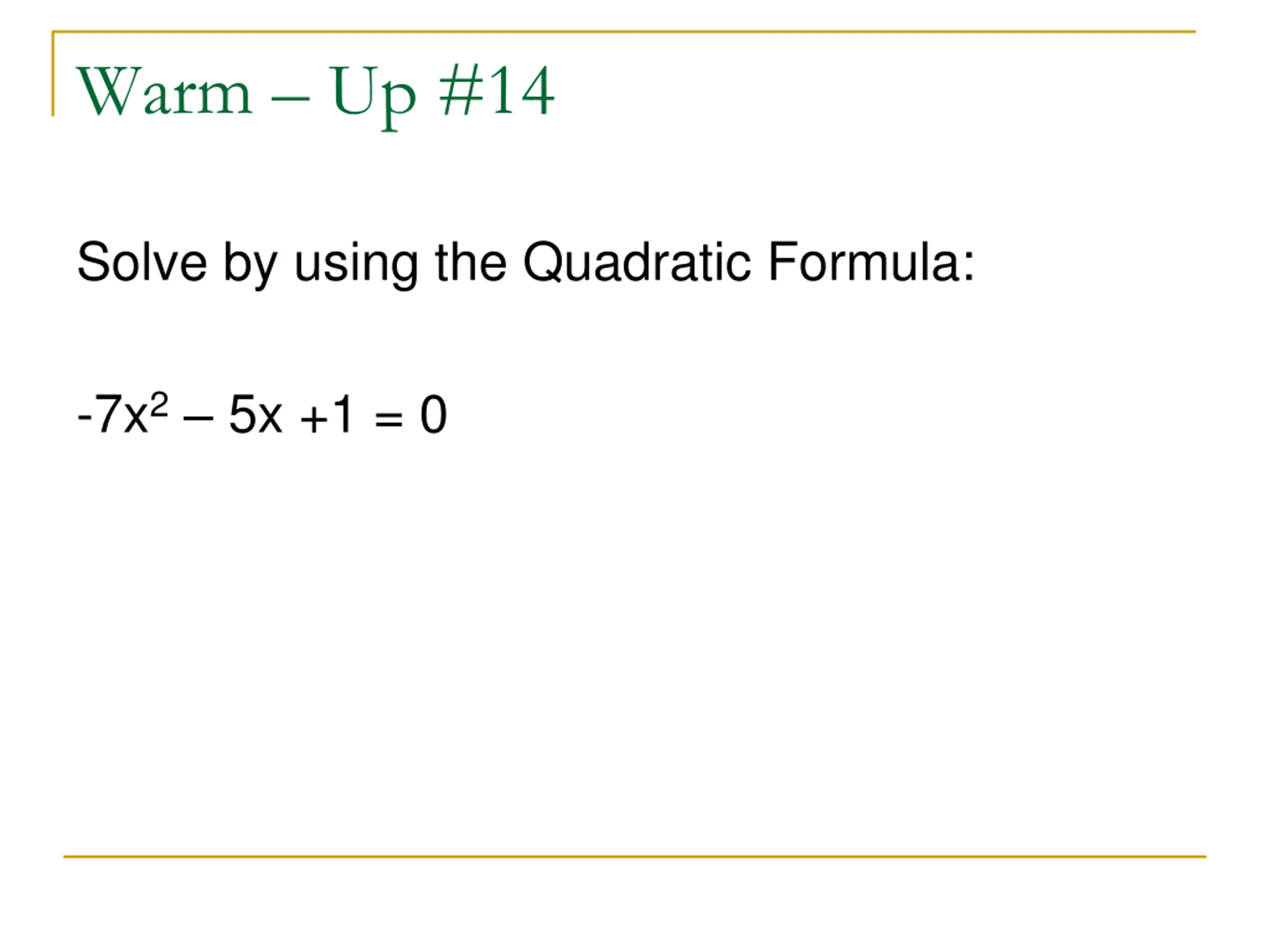 Warm Up #14 Solve by using the Quadratic Formula: -7x2 5x +1 = 0