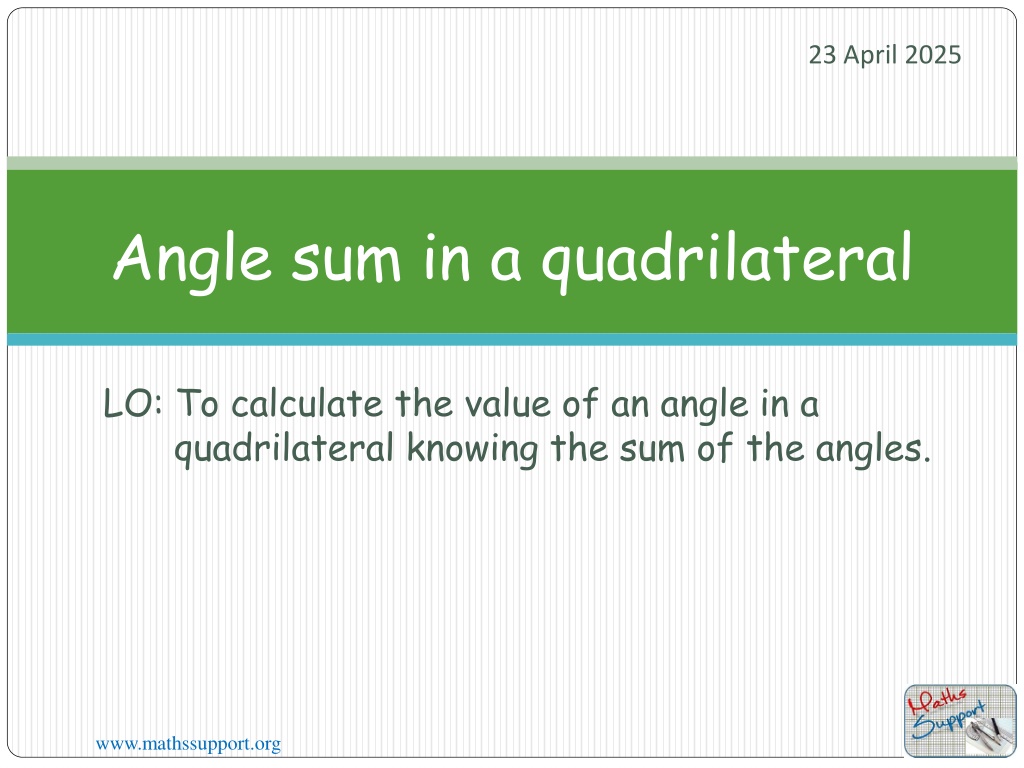 23 April 2025 Angle sum in a quadrilateral LO: To calculate the value of an angle in a quadrilateral knowing the sum of the angles. www.mathssupport.org