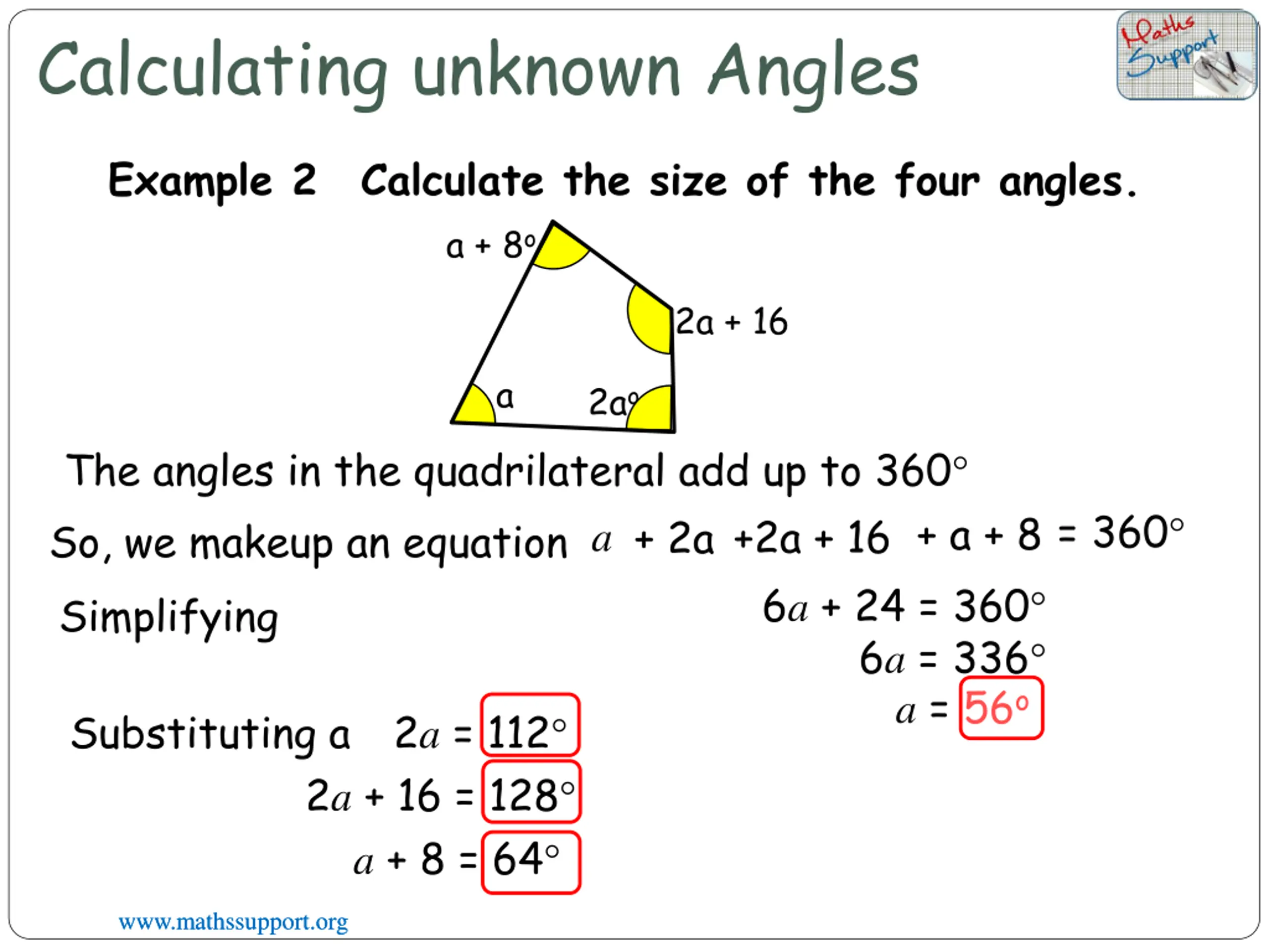 Calculating unknown Angles Example 2 Calculate the size of the four angles. a + 8o 2a + 16 a 2ao The angles in the quadrilateral add up to 360 So, we makeup an equation Simplifying + 2a +2a + 16 + a + 8 = 360 a 6a + 24 = 360 6a = 336 a = 56o 2a = 112 Substituting a 2a + 16 = 128 a + 8 = 64 www.mathssupport.org www.mathssupport.org