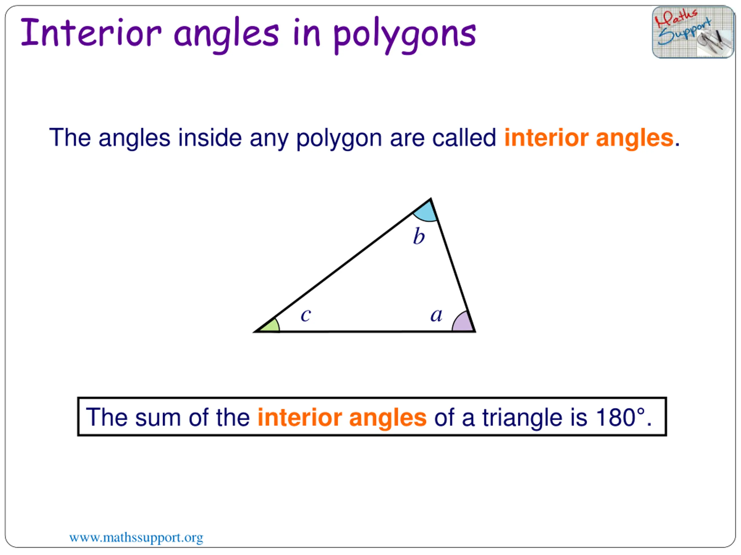 Interior angles in polygons The angles inside any polygon are called interior angles. b c a The sum of the interior angles of a triangle is 180 . www.mathssupport.org