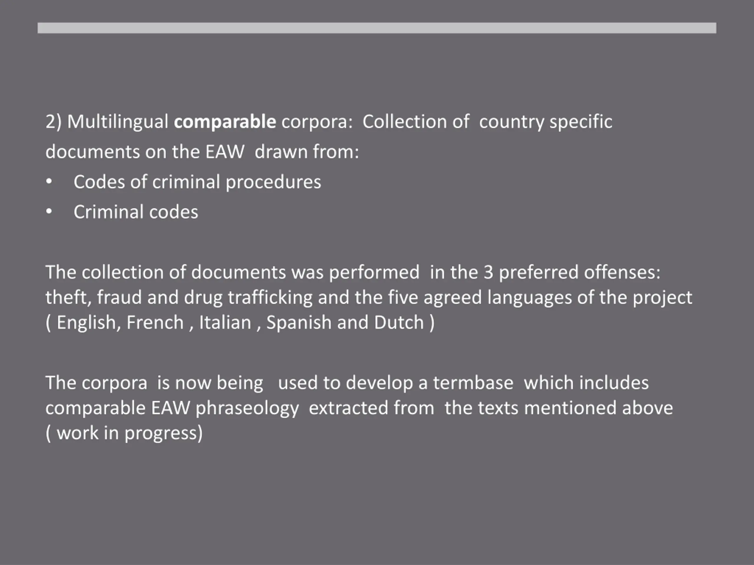 2) Multilingual comparable corpora: Collection of country specific documents on the EAW drawn from: Codes of criminal procedures Criminal codes The collection of documents was performed in the 3 preferred offenses: theft, fraud and drug trafficking and the five agreed languages of the project ( English, French , Italian , Spanish and Dutch ) The corpora is now being used to develop a termbase which includes comparable EAW phraseology extracted from the texts mentioned above ( work in progress)