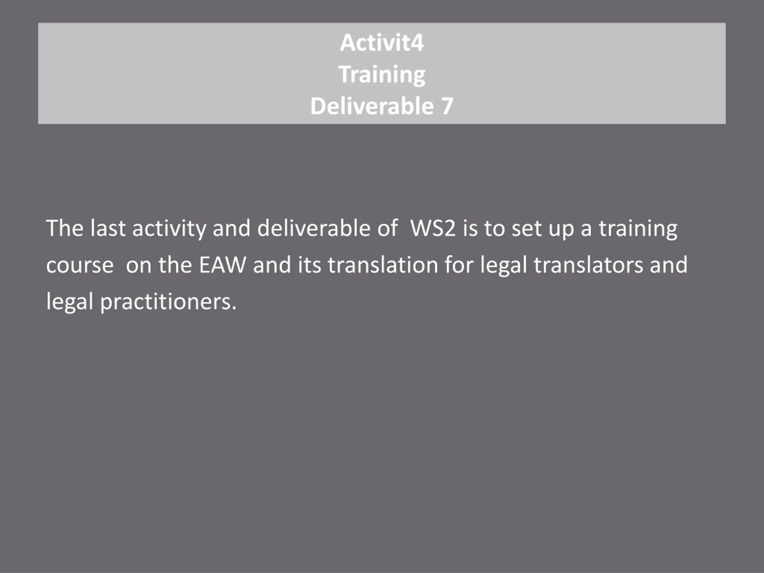 Activit4 Training Deliverable 7 The last activity and deliverable of WS2 is to set up a training course on the EAW and its translation for legal translators and legal practitioners.