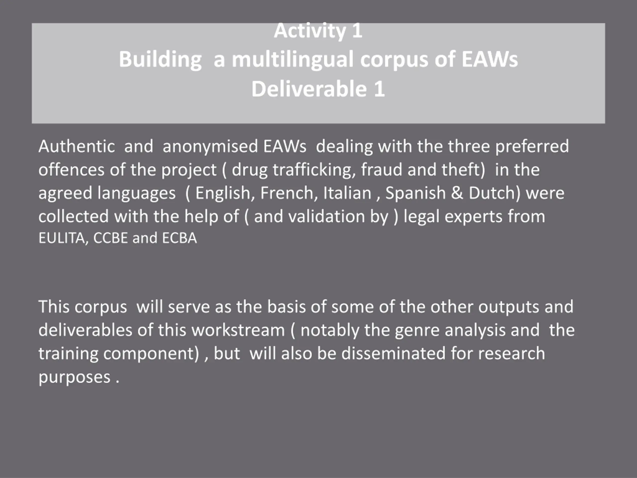 Activity 1 Building a multilingual corpus of EAWs Deliverable 1 Authentic and anonymised EAWs dealing with the three preferred offences of the project ( drug trafficking, fraud and theft) in the agreed languages ( English, French, Italian , Spanish & Dutch) were collected with the help of ( and validation by ) legal experts from EULITA, CCBE and ECBA This corpus will serve as the basis of some of the other outputs and deliverables of this workstream ( notably the genre analysis and the training component) , but will also be disseminated for research purposes .