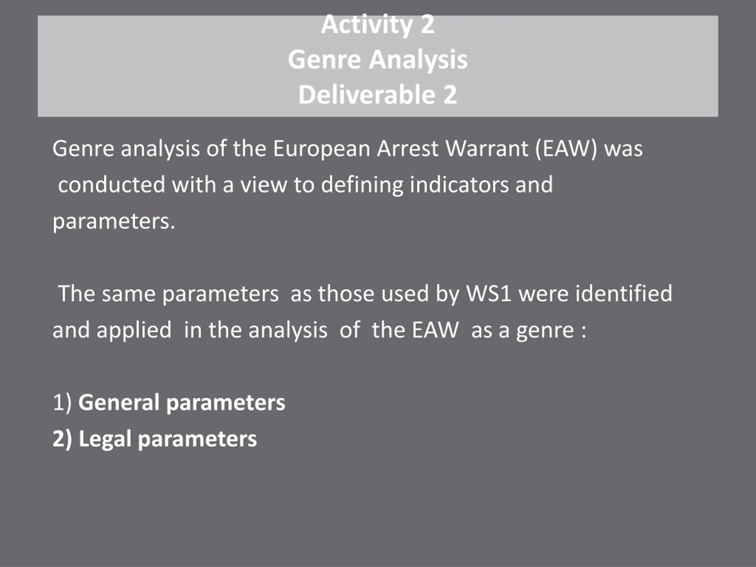 Activity 2 Genre Analysis Deliverable 2 Genre analysis of the European Arrest Warrant (EAW) was conducted with a view to defining indicators and parameters. The same parameters as those used by WS1 were identified and applied in the analysis of the EAW as a genre : 1) General parameters 2) Legal parameters