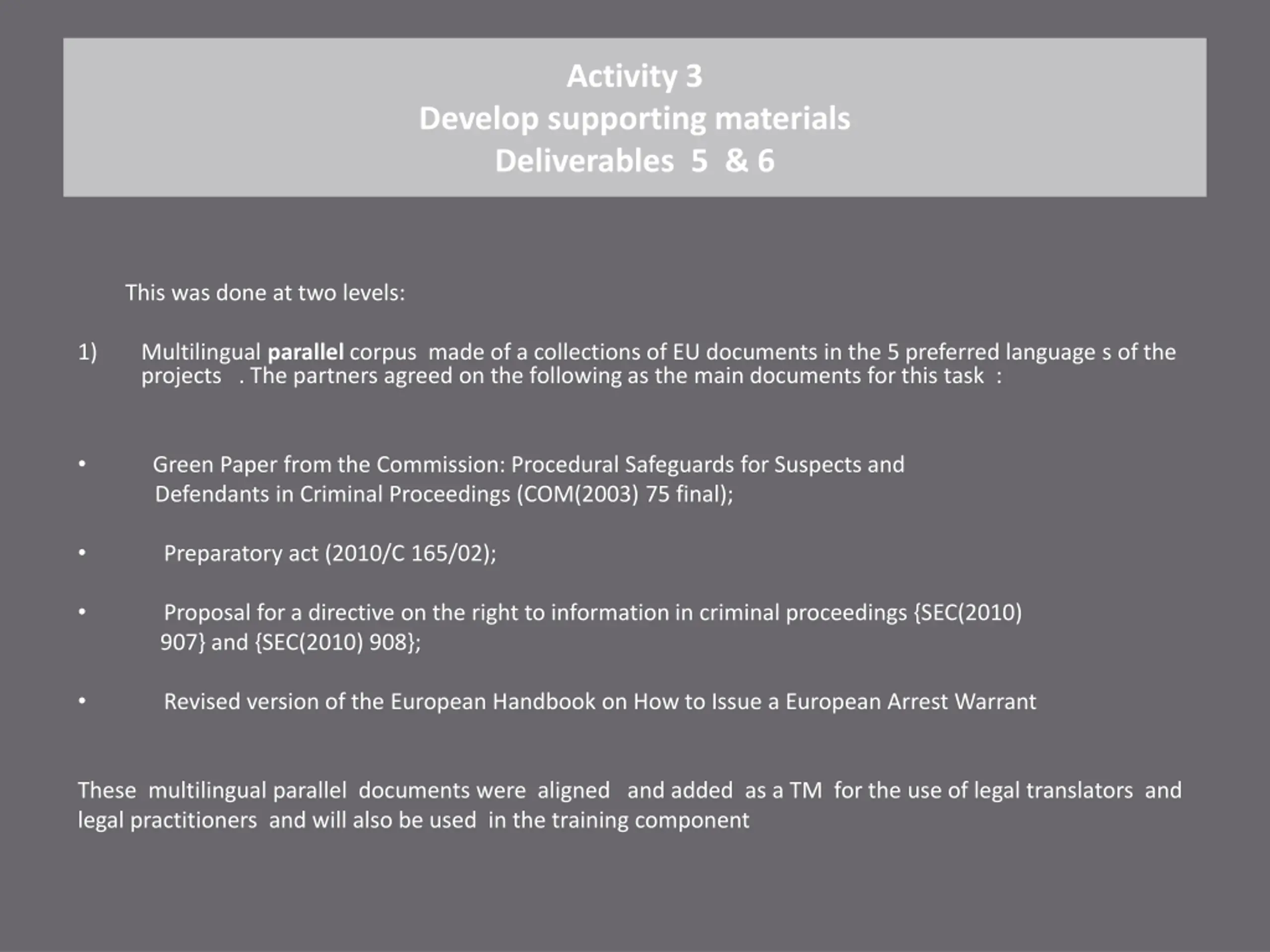 Activity 3 Develop supporting materials Deliverables 5 & 6 This was done at two levels: 1) Multilingual parallel corpus made of a collections of EU documents in the 5 preferred language s of the projects . The partners agreed on the following as the main documents for this task : Green Paper from the Commission: Procedural Safeguards for Suspects and Defendants in Criminal Proceedings (COM(2003) 75 final); Preparatory act (2010/C 165/02); 907} and {SEC(2010) 908}; Proposal for a directive on the right to information in criminal proceedings {SEC(2010) Revised version of the European Handbook on How to Issue a European Arrest Warrant These multilingual parallel documents were aligned and added as a TM for the use of legal translators and legal practitioners and will also be used in the training component