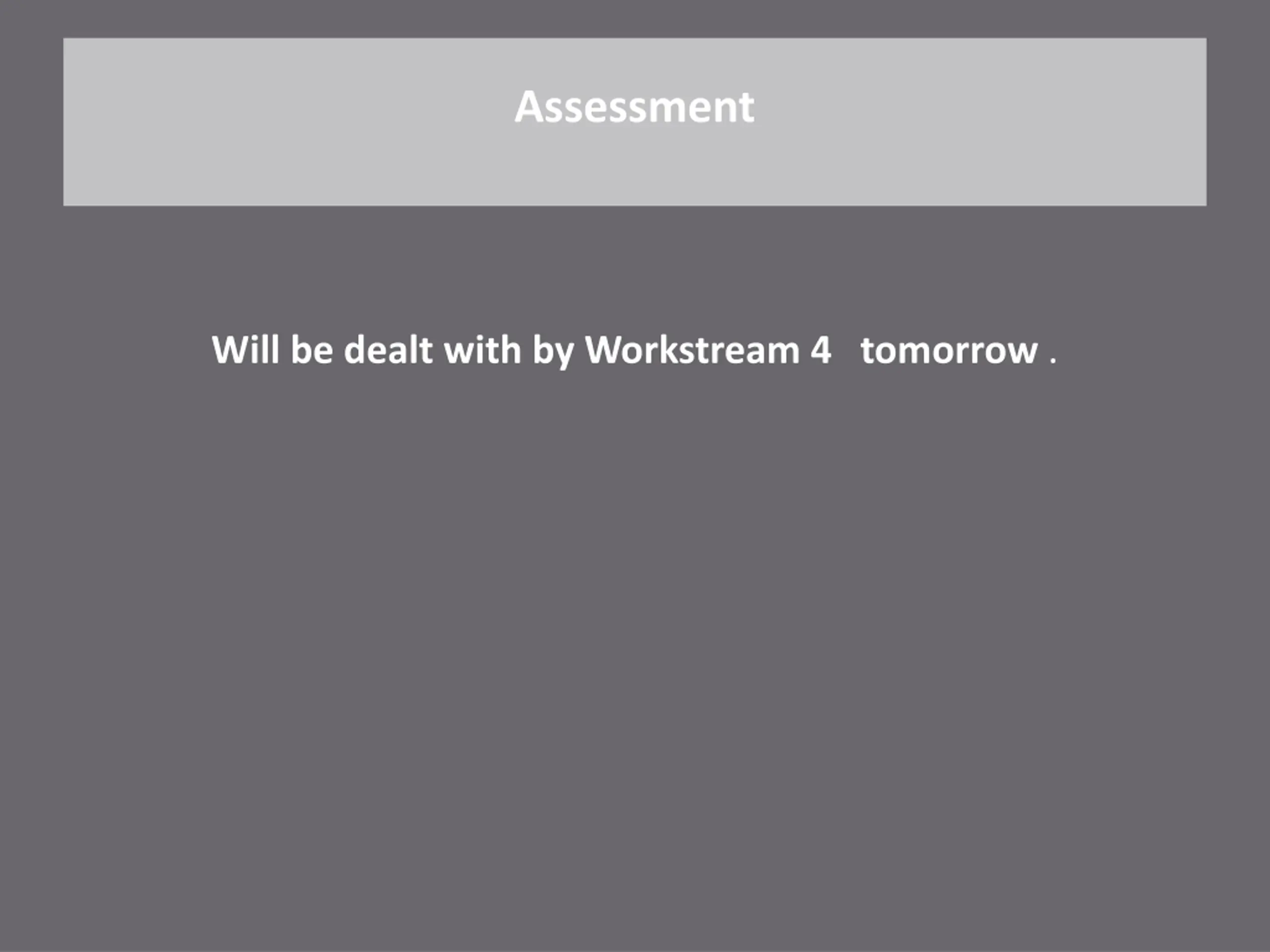 Assessment Will be dealt with by Workstream 4 tomorrow .
