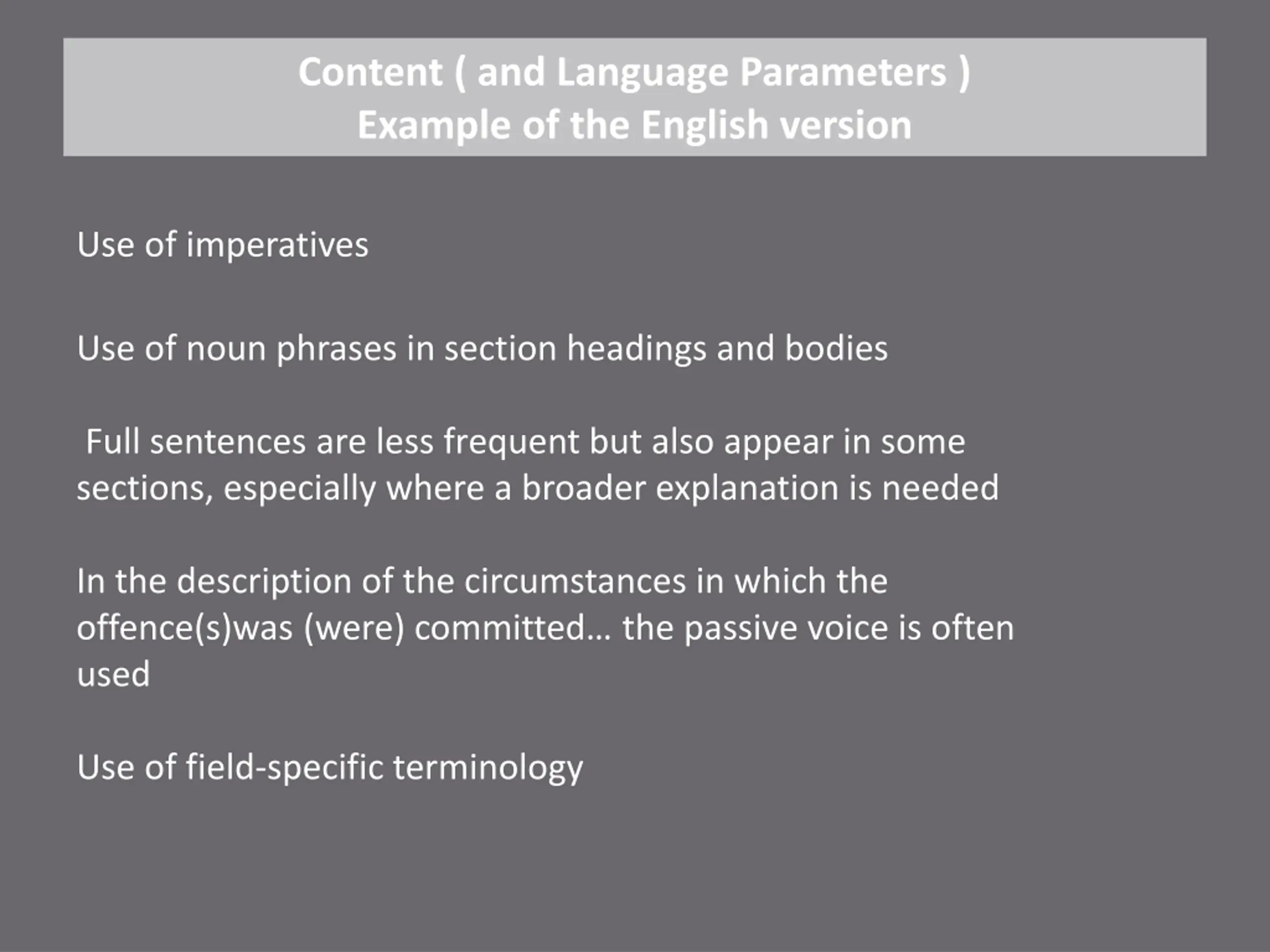 Content ( and Language Parameters ) Example of the English version Use of imperatives Use of noun phrases in section headings and bodies Full sentences are less frequent but also appear in some sections, especially where a broader explanation is needed In the description of the circumstances in which the offence(s)was (were) committed the passive voice is often used Use of field-specific terminology