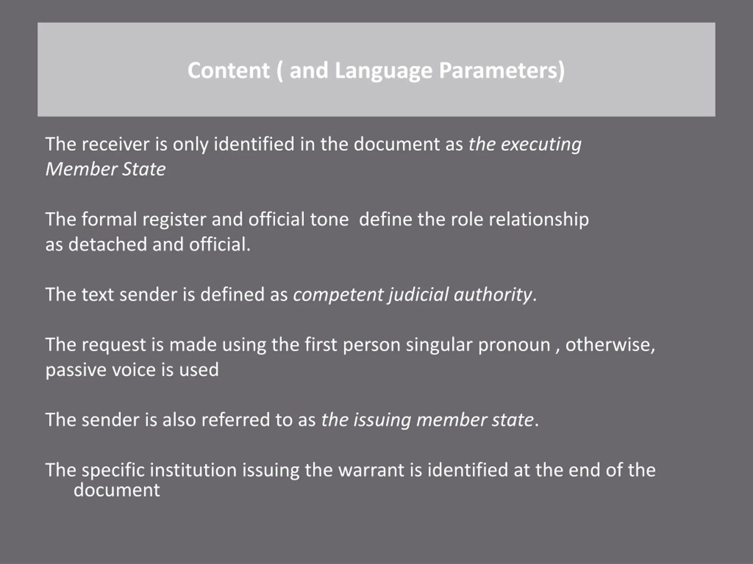 Content ( and Language Parameters) The receiver is only identified in the document as the executing Member State The formal register and official tone define the role relationship as detached and official. The text sender is defined as competent judicial authority. The request is made using the first person singular pronoun , otherwise, passive voice is used The sender is also referred to as the issuing member state. The specific institution issuing the warrant is identified at the end of the document
