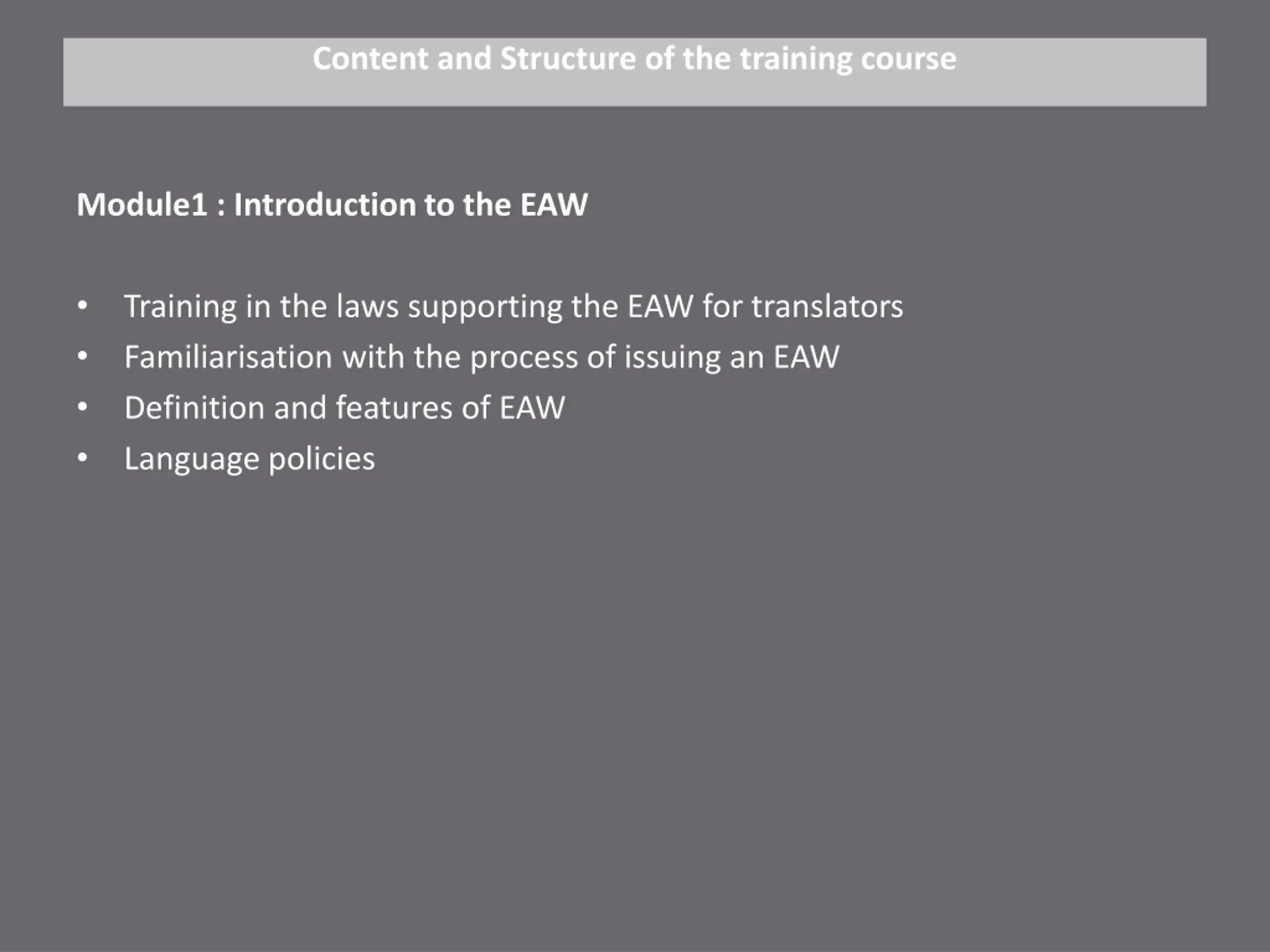 Content and Structure of the training course Module1 : Introduction to the EAW Training in the laws supporting the EAW for translators Familiarisation with the process of issuing an EAW Definition and features of EAW Language policies