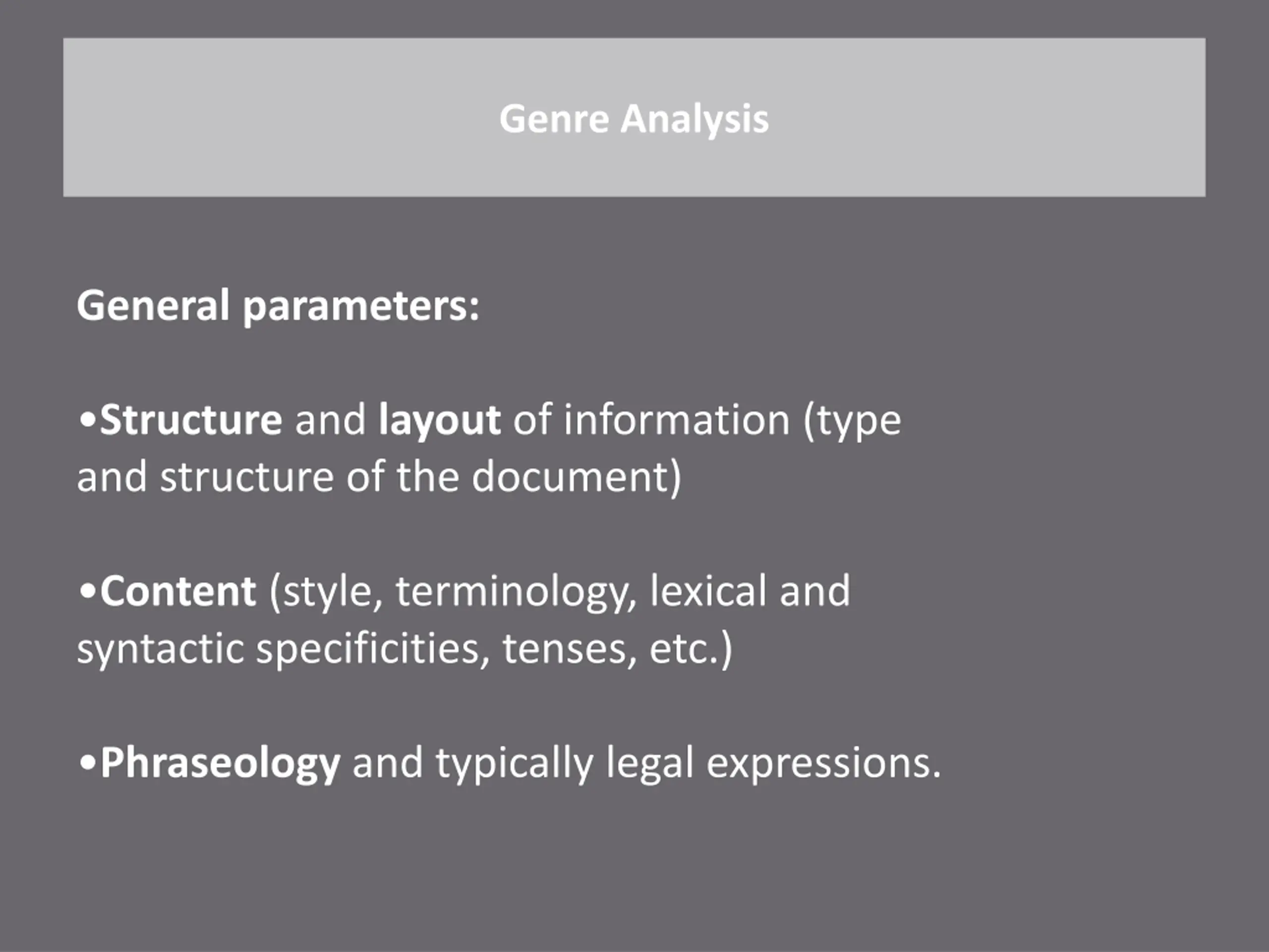 Genre Analysis General parameters: Structure and layout of information (type and structure of the document) Content (style, terminology, lexical and syntactic specificities, tenses, etc.) Phraseology and typically legal expressions.