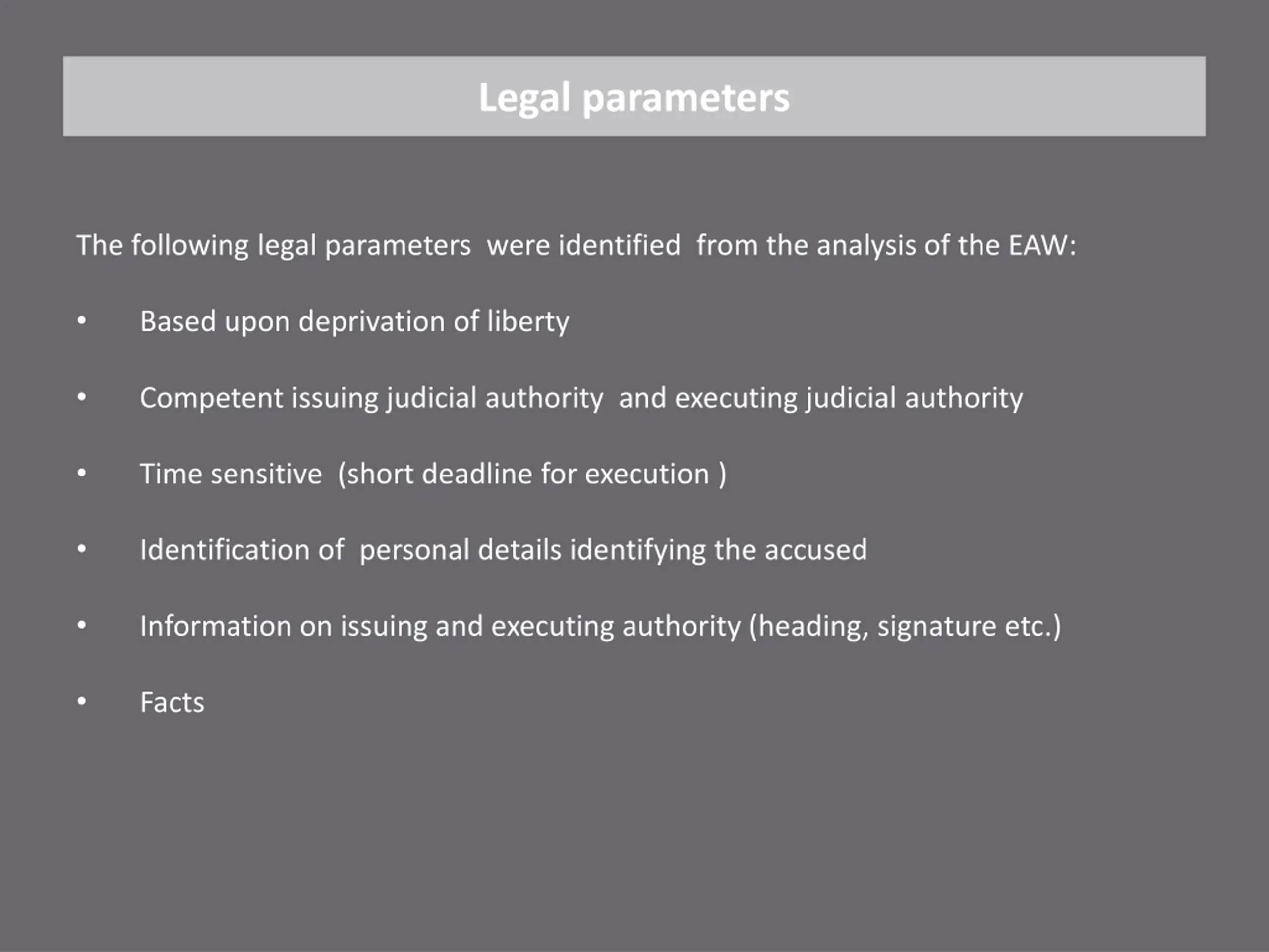 Legal parameters The following legal parameters were identified from the analysis of the EAW: Based upon deprivation of liberty Competent issuing judicial authority and executing judicial authority Time sensitive (short deadline for execution ) Identification of personal details identifying the accused Information on issuing and executing authority (heading, signature etc.) Facts