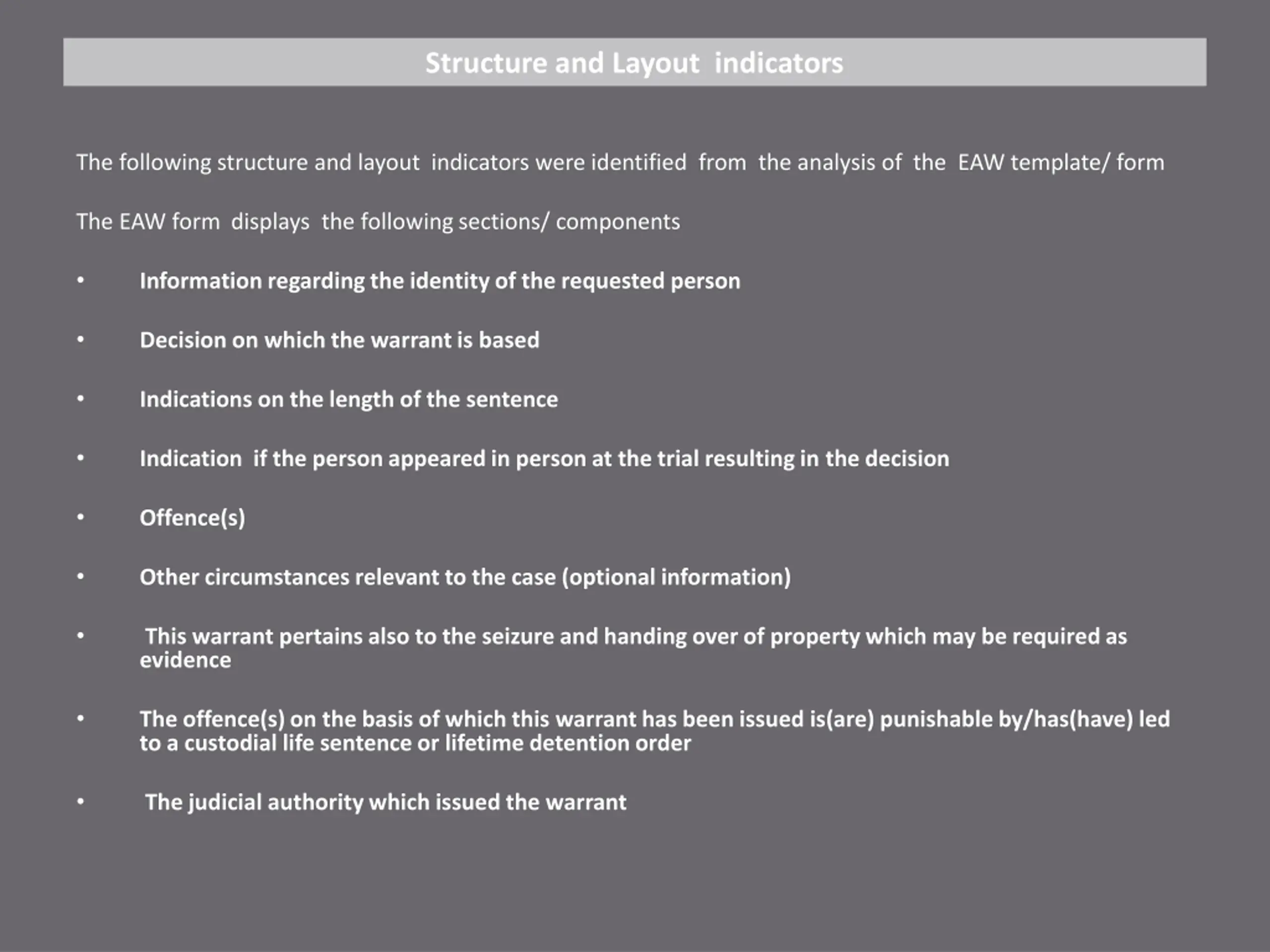 Structure and Layout indicators The following structure and layout indicators were identified from the analysis of the EAW template/ form The EAW form displays the following sections/ components Information regarding the identity of the requested person Decision on which the warrant is based Indications on the length of the sentence Indication if the person appeared in person at the trial resulting in the decision Offence(s) Other circumstances relevant to the case (optional information) This warrant pertains also to the seizure and handing over of property which may be required as evidence The offence(s) on the basis of which this warrant has been issued is(are) punishable by/has(have) led to a custodial life sentence or lifetime detention order The judicial authority which issued the warrant