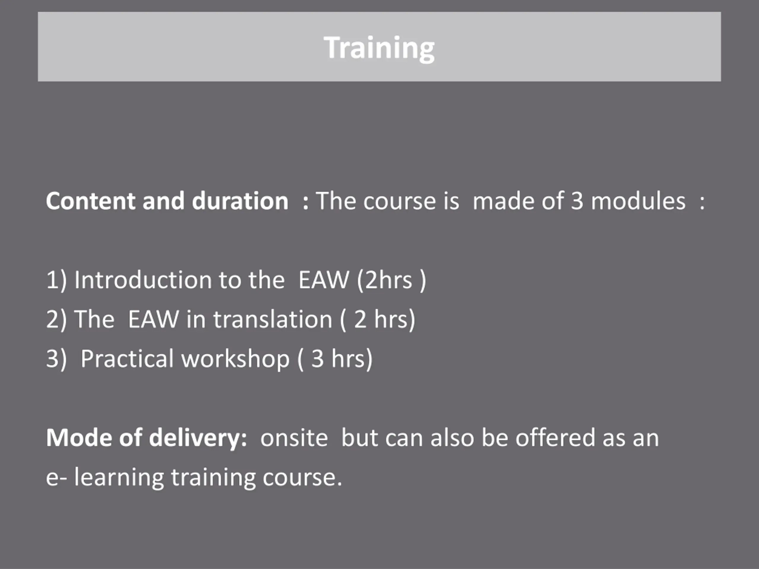 Training Content and duration : The course is made of 3 modules : 1) Introduction to the EAW (2hrs ) 2) The EAW in translation ( 2 hrs) 3) Practical workshop ( 3 hrs) Mode of delivery: onsite but can also be offered as an e- learning training course.
