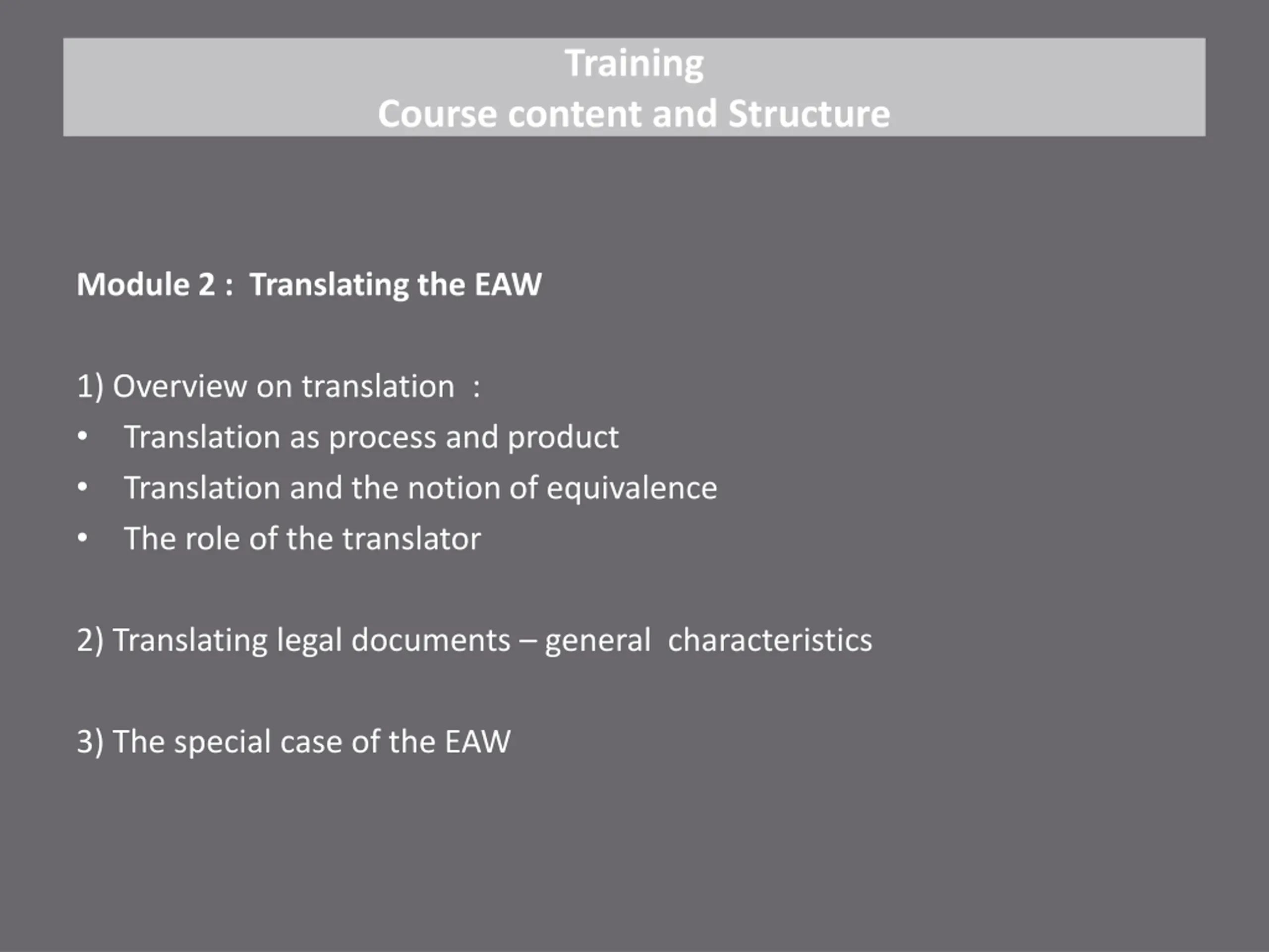 Training Course content and Structure Module 2 : Translating the EAW 1) Overview on translation : Translation as process and product Translation and the notion of equivalence The role of the translator 2) Translating legal documents general characteristics 3) The special case of the EAW