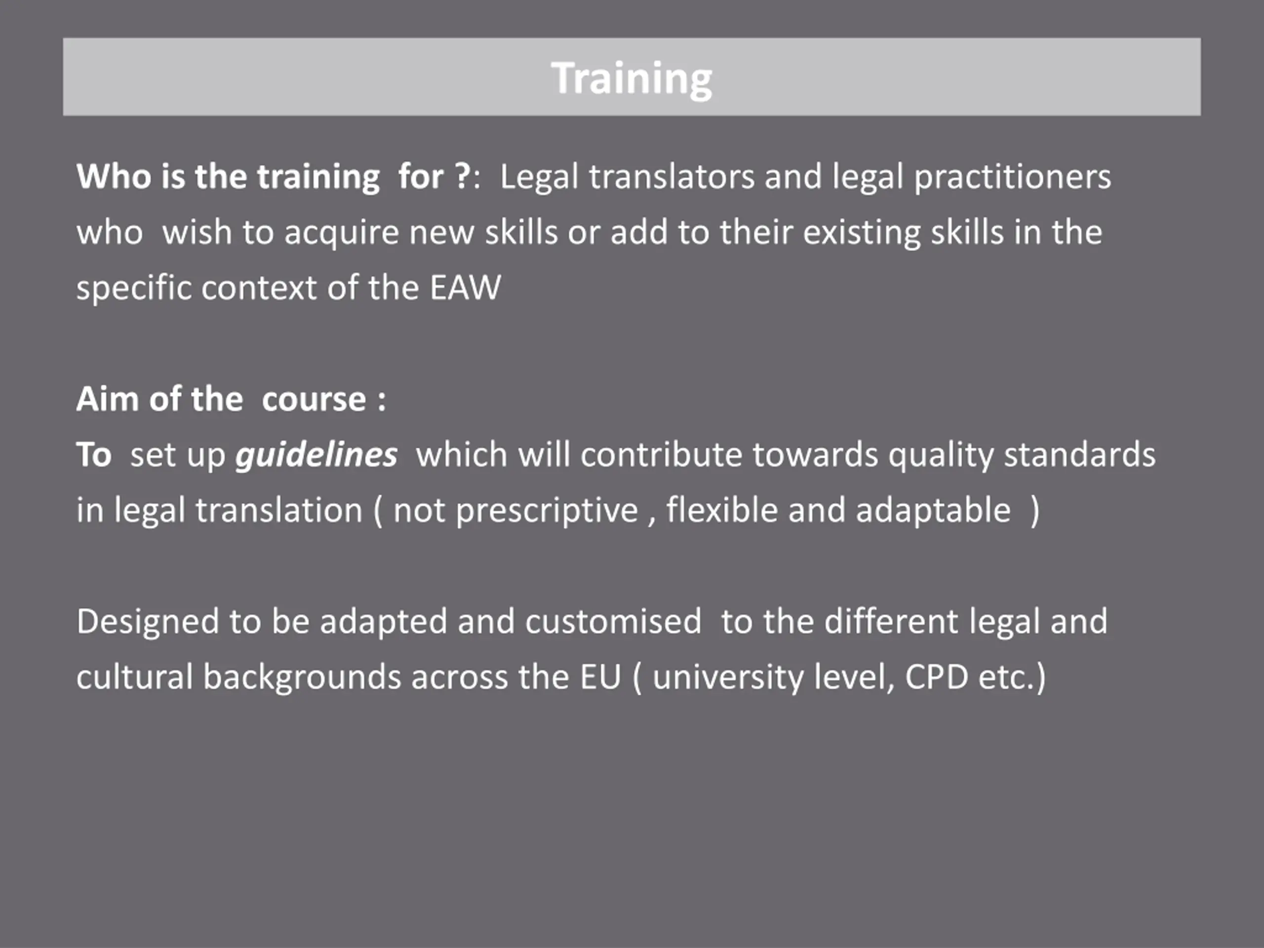 Training Who is the training for ?: Legal translators and legal practitioners who wish to acquire new skills or add to their existing skills in the specific context of the EAW Aim of the course : To set up guidelineswhich will contribute towards quality standards in legal translation ( not prescriptive , flexible and adaptable ) Designed to be adapted and customised to the different legal and cultural backgrounds across the EU ( university level, CPD etc.)