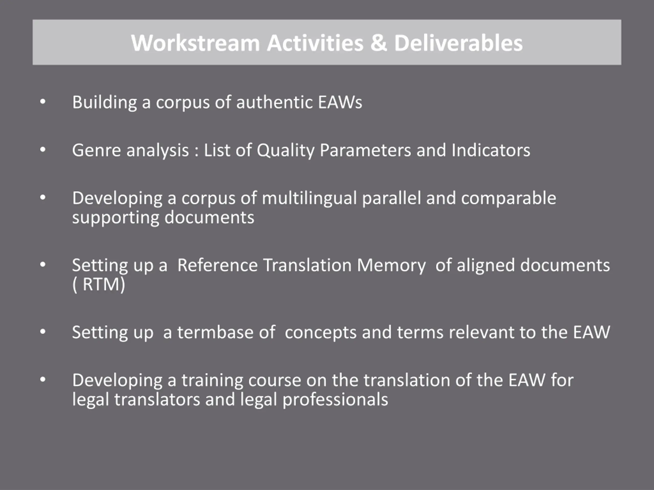 Workstream Activities & Deliverables Building a corpus of authentic EAWs Genre analysis : List of Quality Parameters and Indicators Developing a corpus of multilingual parallel and comparable supporting documents Setting up a Reference Translation Memory of aligned documents ( RTM) Setting up a termbase of concepts and terms relevant to the EAW Developing a training course on the translation of the EAW for legal translators and legal professionals