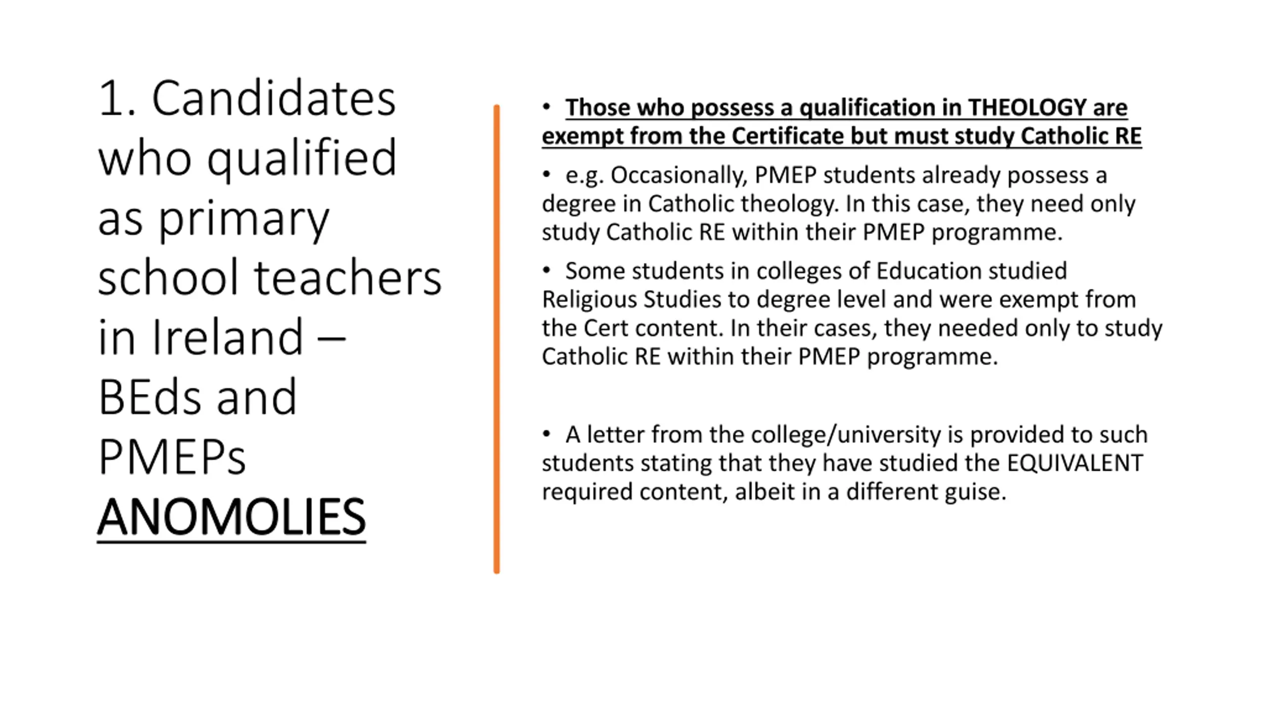 1. Candidates who qualified as primary school teachers in Ireland BEds and PMEPs ANOMOLIES ANOMOLIES Those who possess a qualification in THEOLOGY are exempt from the Certificate but must study Catholic RE e.g. Occasionally, PMEP students already possess a degree in Catholic theology. In this case, they need only study Catholic RE within their PMEP programme. Some students in colleges of Education studied Religious Studies to degree level and were exempt from the Cert content. In their cases, they needed only to study Catholic RE within their PMEP programme. A letter from the college/university is provided to such students stating that they have studied the EQUIVALENT required content, albeit in a different guise.