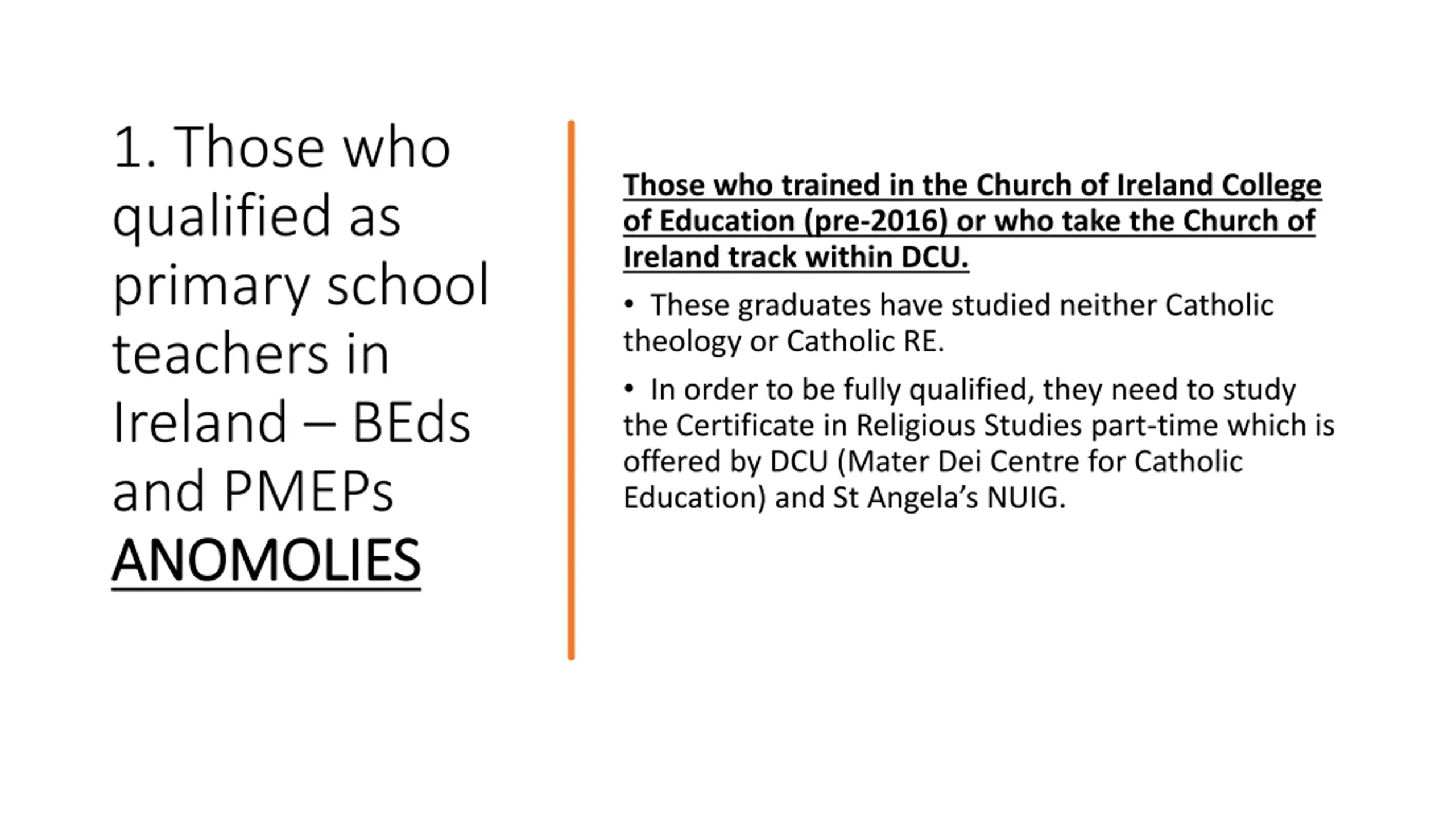 1. Those who qualified as primary school teachers in Ireland BEds and PMEPs ANOMOLIES ANOMOLIES Those who trained in the Church of Ireland College of Education (pre-2016) or who take the Church of Ireland track within DCU. These graduates have studied neither Catholic theology or Catholic RE. In order to be fully qualified, they need to study the Certificate in Religious Studies part-time which is offered by DCU (Mater Dei Centre for Catholic Education) and St Angela s NUIG.