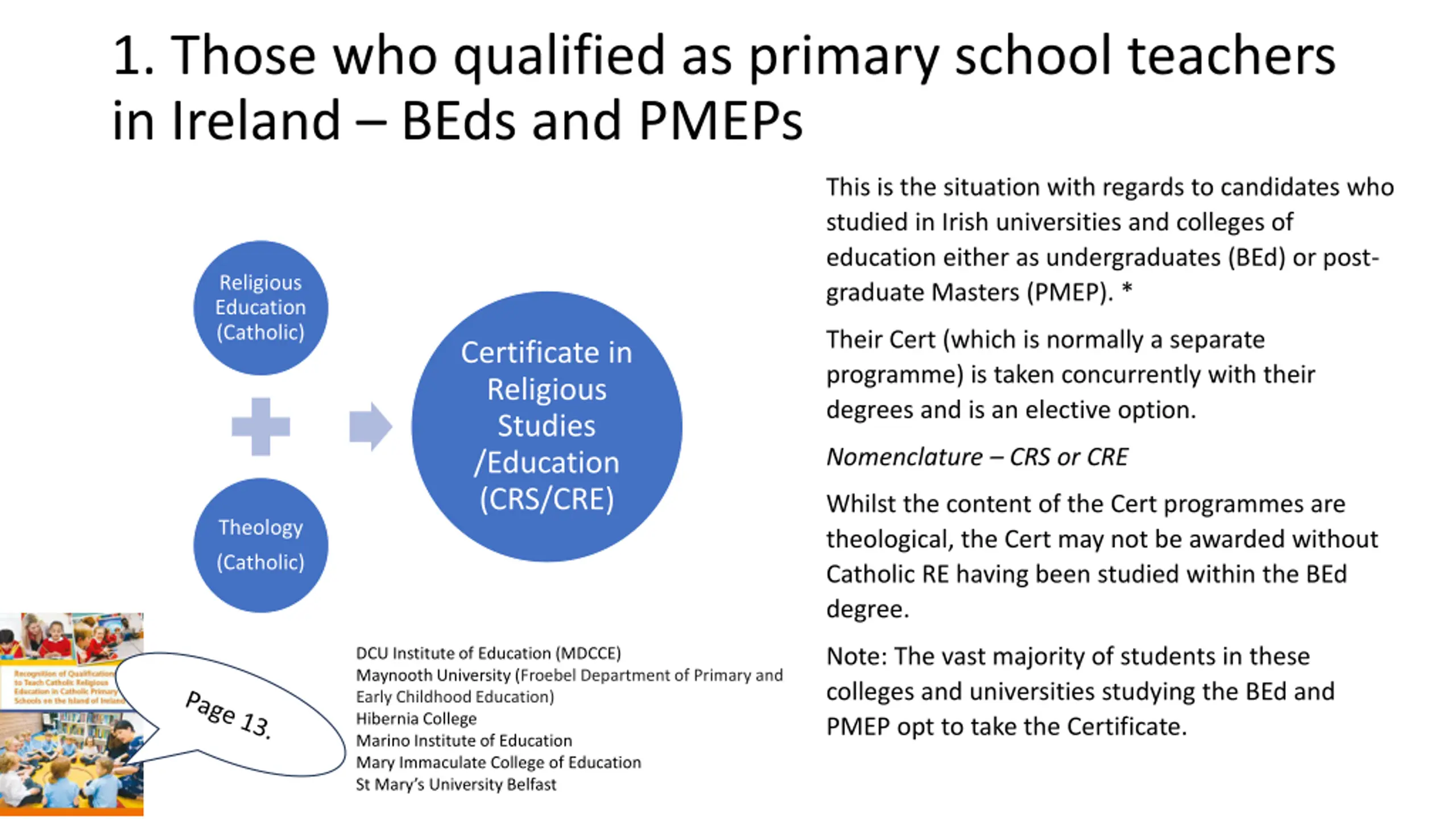 1. Those who qualified as primary school teachers in Ireland BEds and PMEPs This is the situation with regards to candidates who studied in Irish universities and colleges of education either as undergraduates (BEd) or post- graduate Masters (PMEP). * Religious Education (Catholic) Their Cert (which is normally a separate programme) is taken concurrently with their degrees and is an elective option. Certificate in Religious Studies /Education (CRS/CRE) Nomenclature CRS or CRE Whilst the content of the Cert programmes are theological, the Cert may not be awarded without Catholic RE having been studied within the BEd degree. Theology (Catholic) Note: The vast majority of students in these colleges and universities studying the BEd and PMEP opt to take the Certificate. DCU Institute of Education (MDCCE) Maynooth University (Froebel Department of Primary and Early Childhood Education) Hibernia College Marino Institute of Education Mary Immaculate College of Education St Mary s University Belfast
