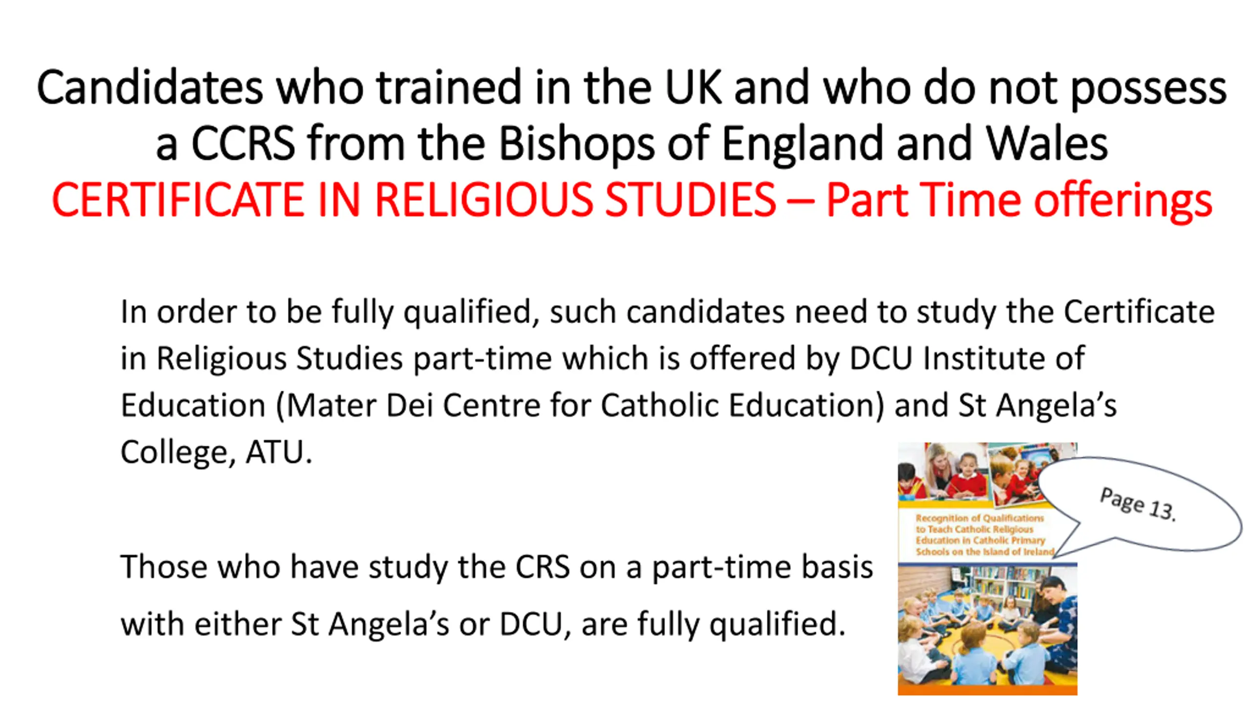 Candidates from Other Jurisdictions Increasingly, graduates from other jurisdictions are seeking information on their qualifications. These are addressed on a case by case basis by the National Director for Catechetics, Dr Alex O Hara (Alex.OHara@iecon.ie) and are assessed for equivalent content and appropriate time spent studying Catholic Theology. If deemed adequate, these candidates are only required to take the CCRS Supplementary top-up course. Otherwise they must complete the full Certificate in Religious Studies on a part time basis at DCU Mater Dei Centre for Catholic Education or St Angelas s NUIG.